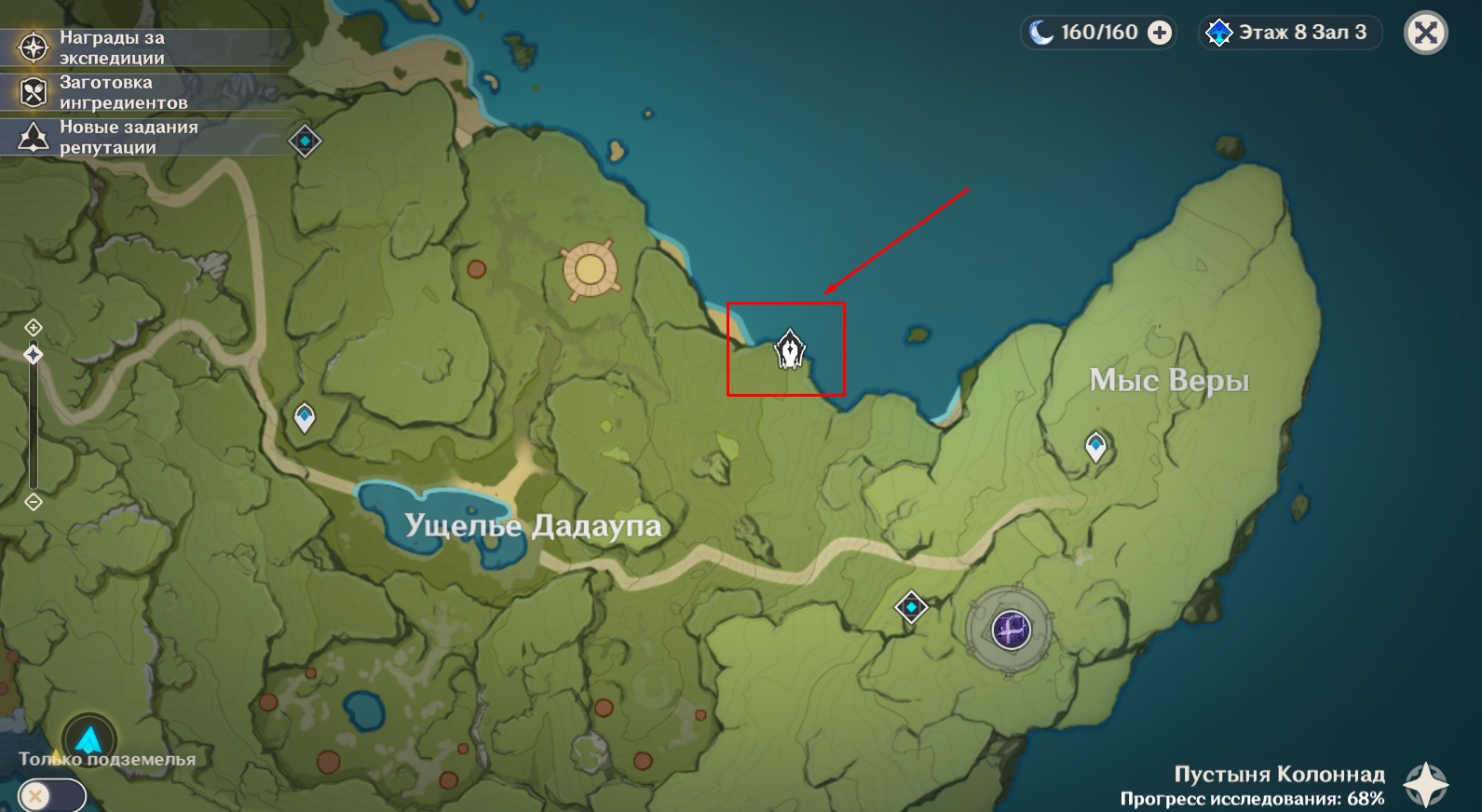 Если у вас есть 20 ранг приключений или выше, откройте карту мира и найдите на Мысе Веры в Мондштадте значок входа в ивентовое подземелье. Телепортируйтесь туда и взаимодействуйте с вратами, чтобы приступить к прохождению испытаний.