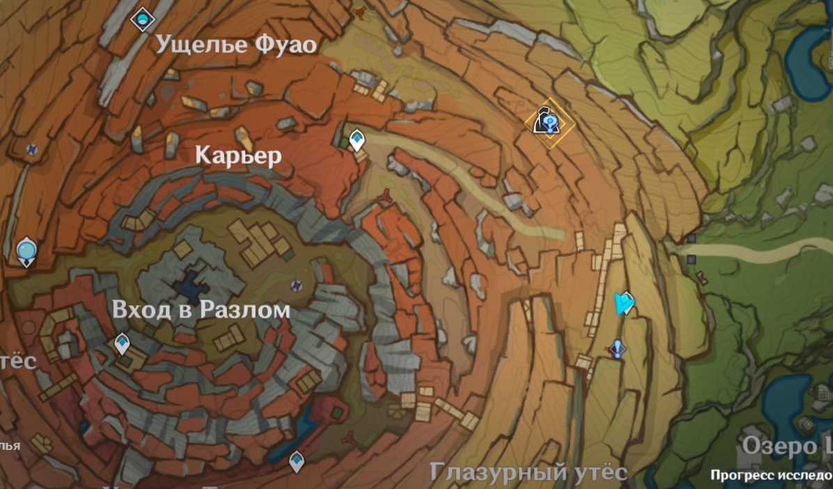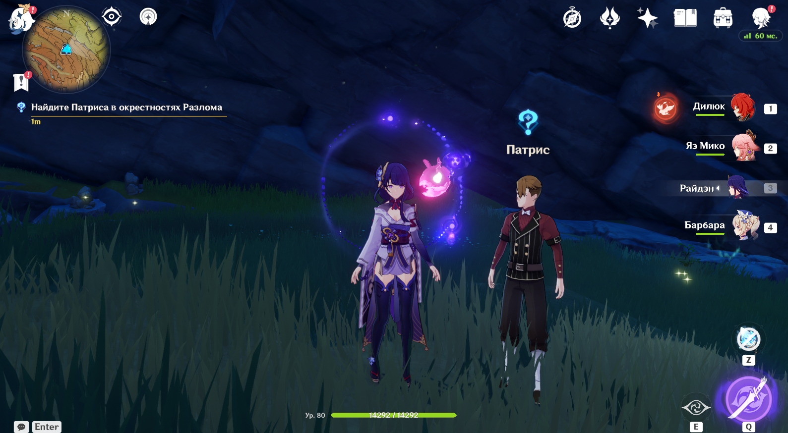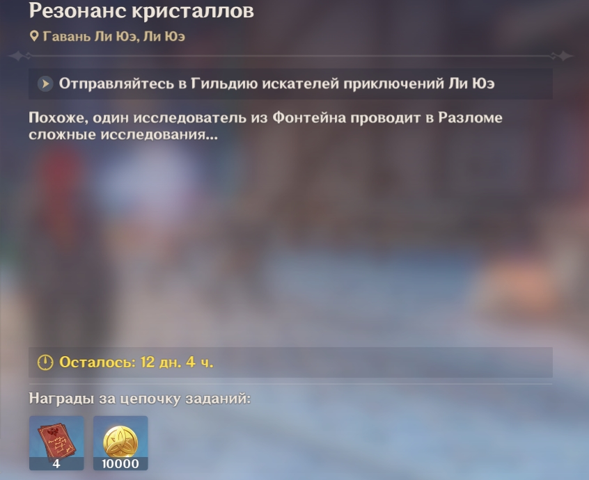 - Телепортируйтесь в Ли Юэ и поговорите с Катериной, секретарем Гильдии искателей приключений. Она расскажет о новом поручении и человеке по имени Патрис, который родом из Фонтейна. Ему нужна помощь в исследовании Разлома. Патрис ждет вас на поверхности Разлома на севере от Глазурного утеса.