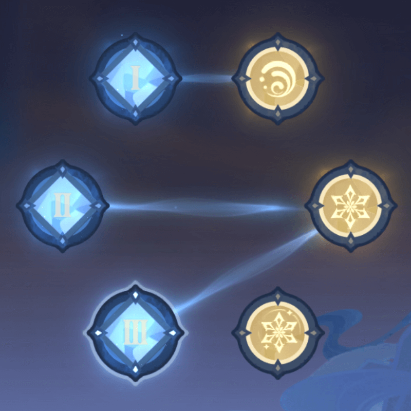 - При прохождении первой половины испытания используйте кристаллы, усиливающие урон от Крио и Гидро стихии. Лучше всего взять в отряд Диону (сильный лекарь) и Сахарозу, чтобы она обеспечила контроль монстров + увеличила мастерство других героев в отряде.