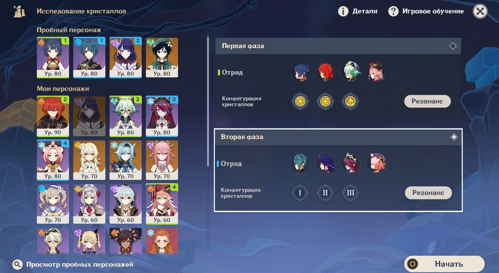 - Ёимия станет основным ДПС во время прохождения первой половины испытания, в то время как стихийные умения Аято и Юнь Цзинь усилят ее обычные атаки. Взрыв стихий и элементальный навык Сян Лин нанесут дополнительный Пиро урон. Рекомендуемая нами настройка резонанса кристаллов идеальна для Ёимии, поскольку чередование ее стихийного навыка и обычной атаки сможет нанести максимально возможный урон.