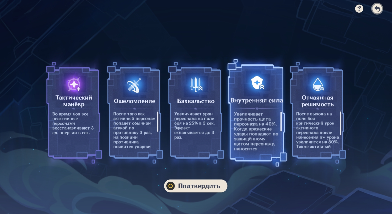 Важно! Набор стратагем генерируется случайным образом. Если вы не нашли в списке предложенных усилений то, что мы рекомендовали, выберите бонусы, которые облегчат вам прохождение испытания.