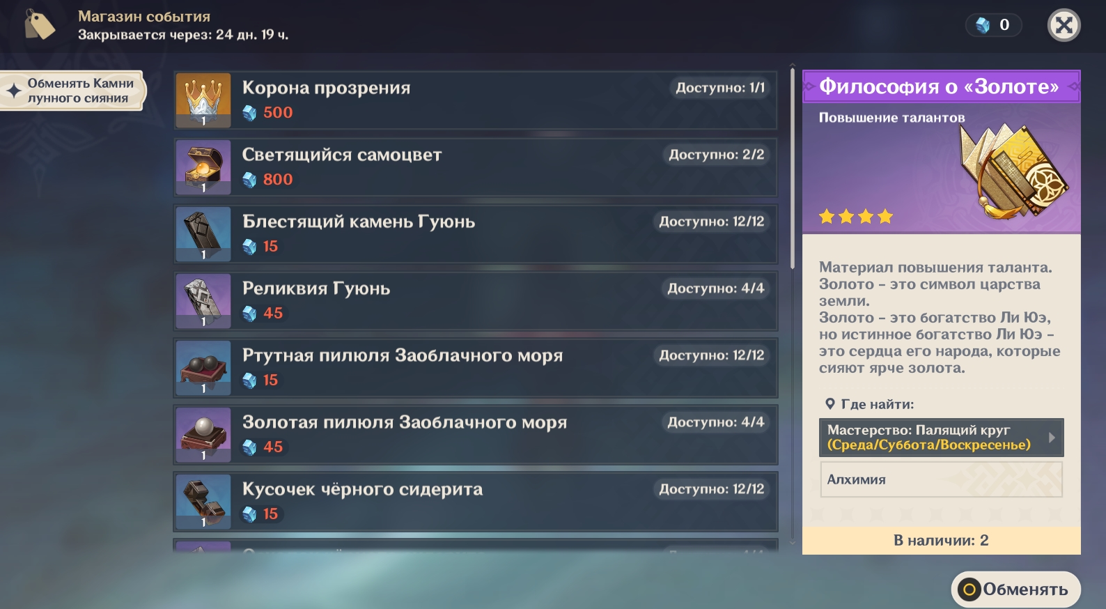 Товары в магазине ивента за Камни лунного сияния и их количество: