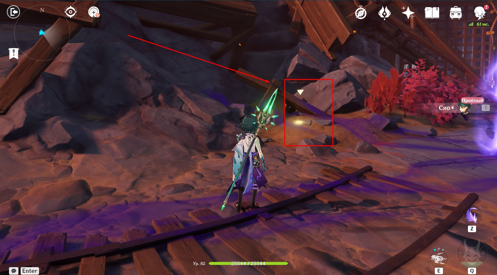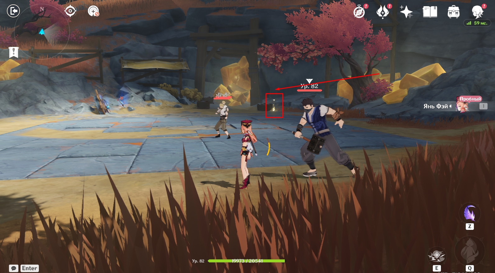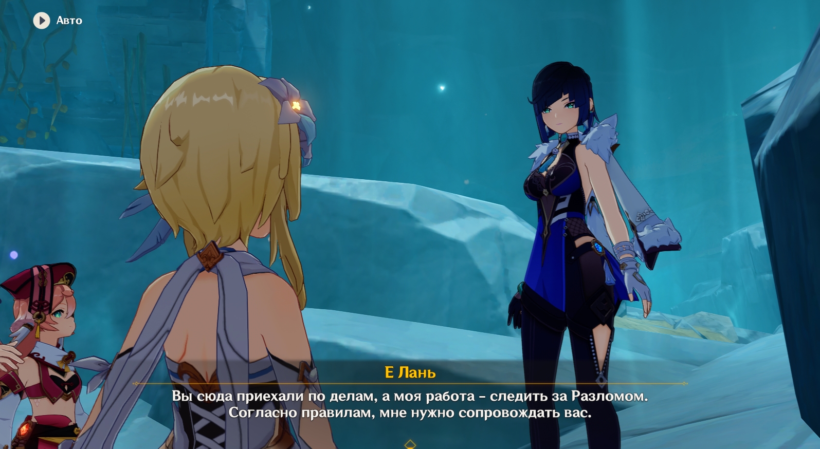 - Узнав, что представители банды Аратаки делают в Разломе, отправляйтесь в центр пещеры под колонну. Там еще раз поговорите с Янь Фэй. Во время кат-сцены вас познакомят с Е Лань. Во время конфликта между Е Лань и Итто земля обвалится и вы упадете на дно Разлома.