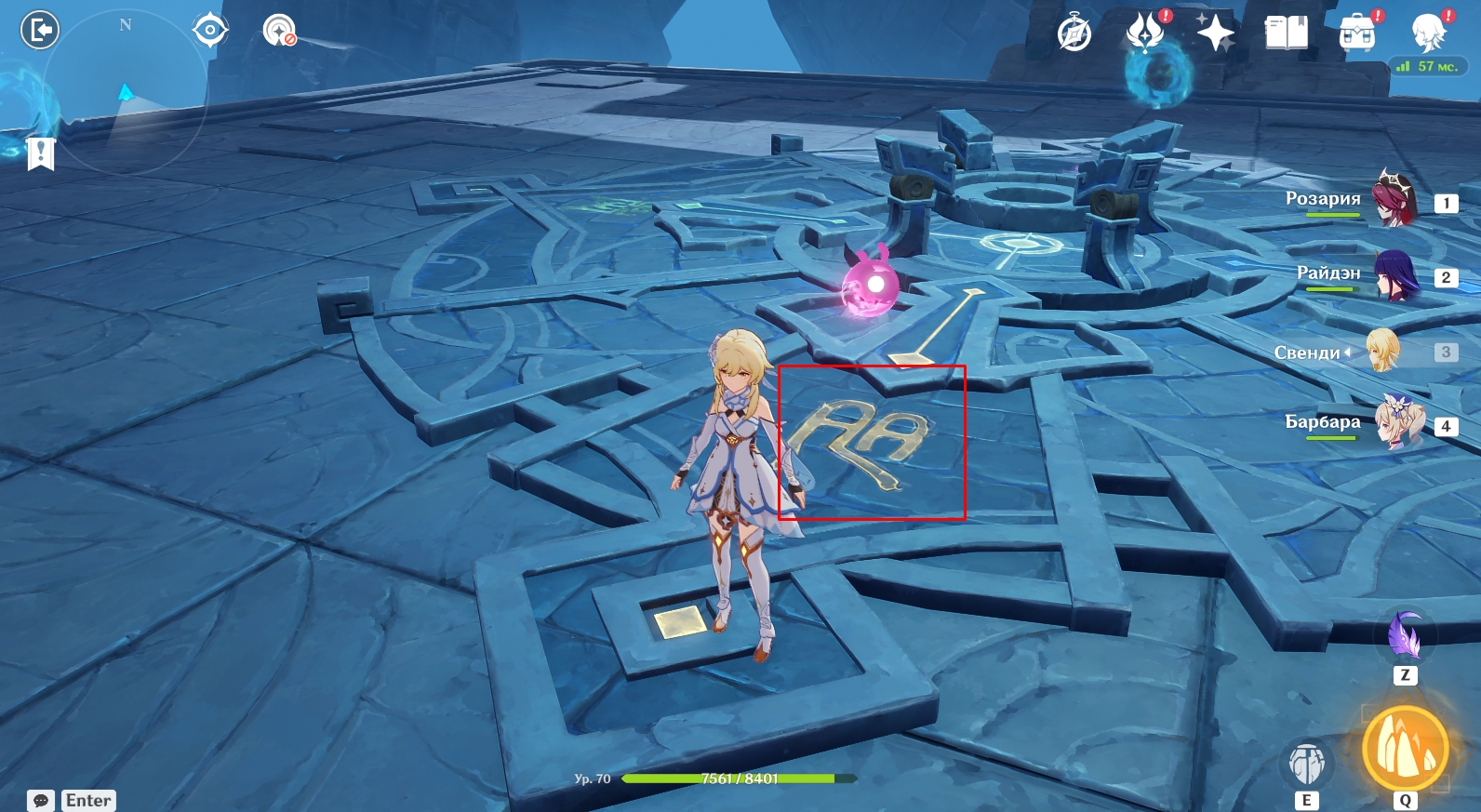 - Какие символы нужно активировать – показано на центральной площадке. К примеру, на центральной площадке имеется желтый символ в виде двух букв А. Телепортируйтесь на боковую площадку с желтыми символами и активируйте все символы в виде двух букв А, наступив на них. Если вы наступите на неправильный символ, герой получит незначительный урон. То же самое нужно сделать со всеми боковыми площадками.