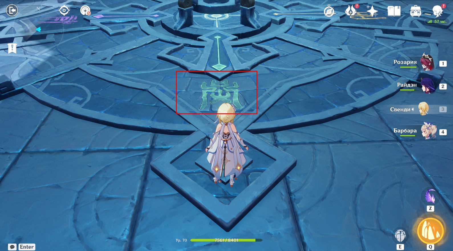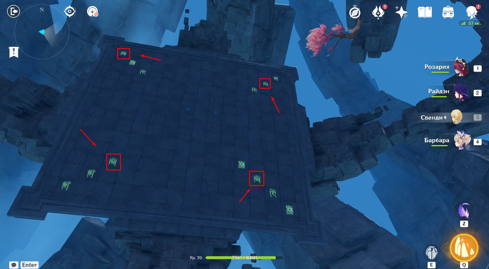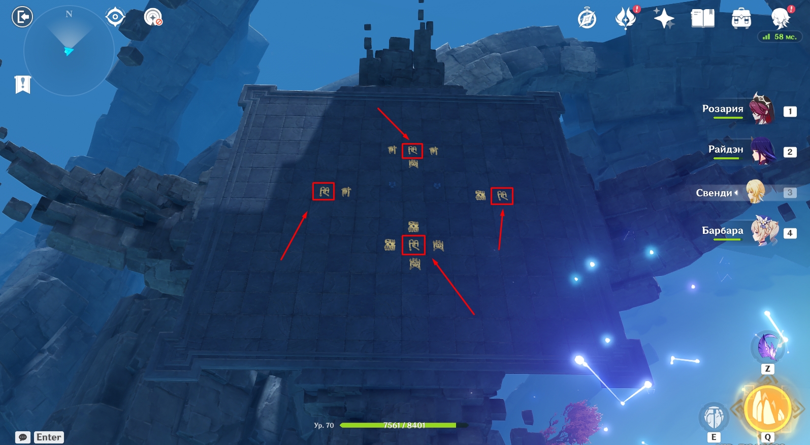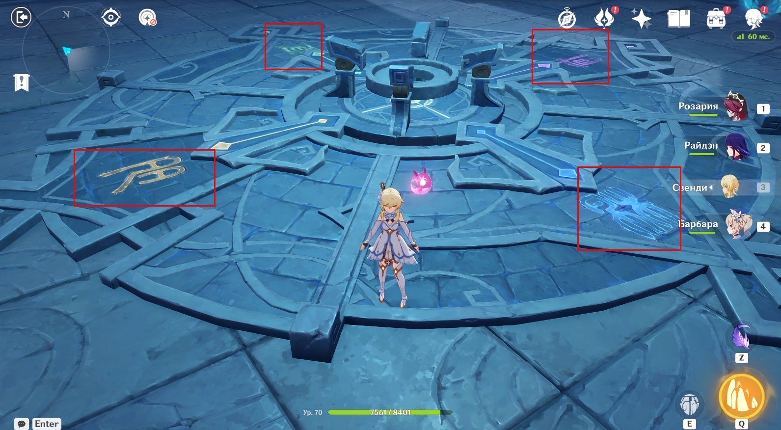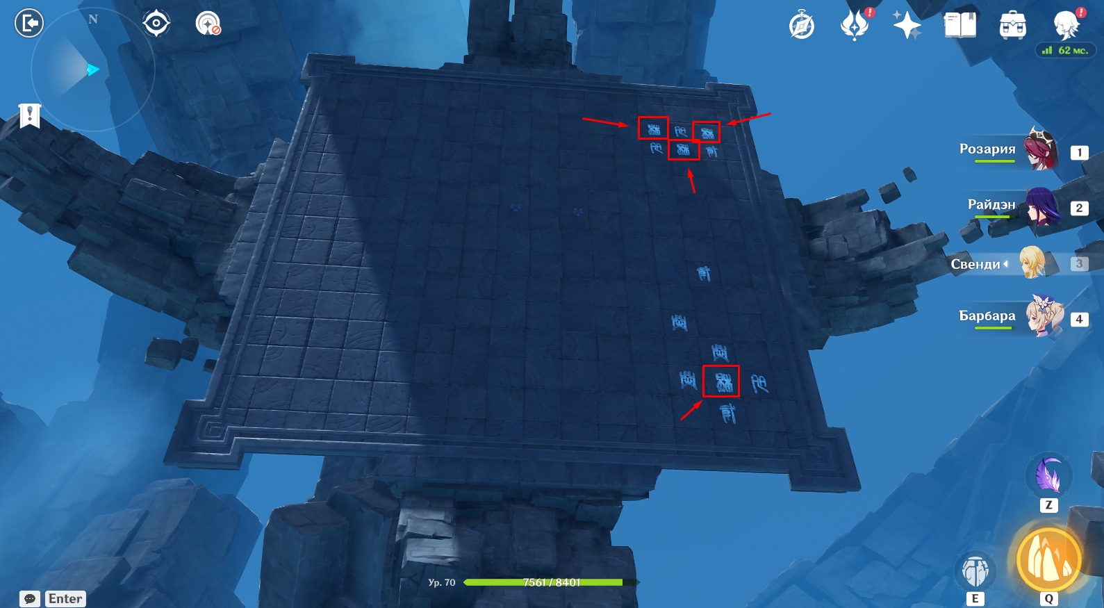 - Вам нужно переместиться на каждую из 4 боковых площадок с помощью круглых порталов (находятся на краю площадок) и активировать конкретные символы.