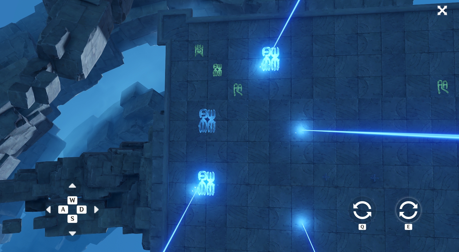 - Когда вы активируете нужные символы на боковой площадке и победите появившихся монстров, в центре активируется два механизма – Ваятели света. Взаимодействуйте с ними, чтобы разместить лучи на крупных символах. AWSD – для перемещения лучей вправо, влево, вверх, вниз, а QE – для поворота лучей по часовой и против часовой стрелки. Когда вы разместите лучи правильно, на главной площадке загорится соответствующий символ. Повторите все те же действия на остальных боковых площадках.