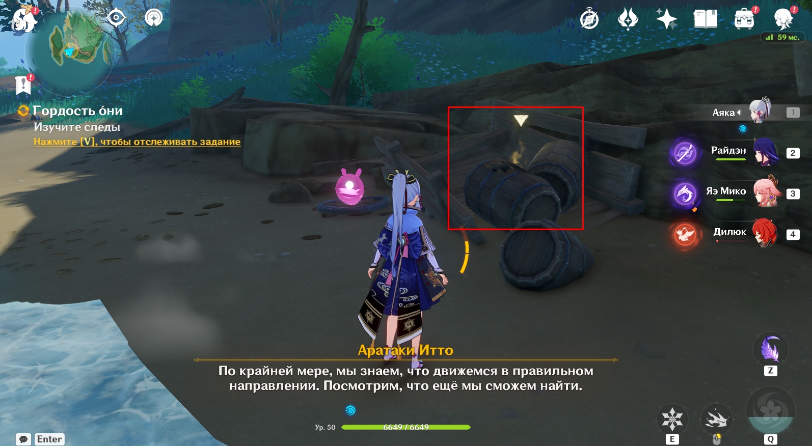 - После очередной кат-сцены отразите атаку комиссии Тенре. Другие члены банды Аратаки помогут вам сбежать. Теперь вам нужно идти по следам Синего они, чтобы найти его. Следы они находятся среди бочек справа от воды. Как только вы осмотрите их, на вас нападут ронины. Вторые следы находятся рядом со скалой за деревьями с фиалковой дыней. Подойдите к скале, посмотрите кат-сцену и войдите в подземелье – убежище ронинов. При подборе героев для прохождения квестового подземелья вы увидите, что требуется 1 персонаж стихии Гео. Выбирать его не обязательно, поскольку вы получите пробного Аратаки Итто, а он как раз относится к элементу Гео.