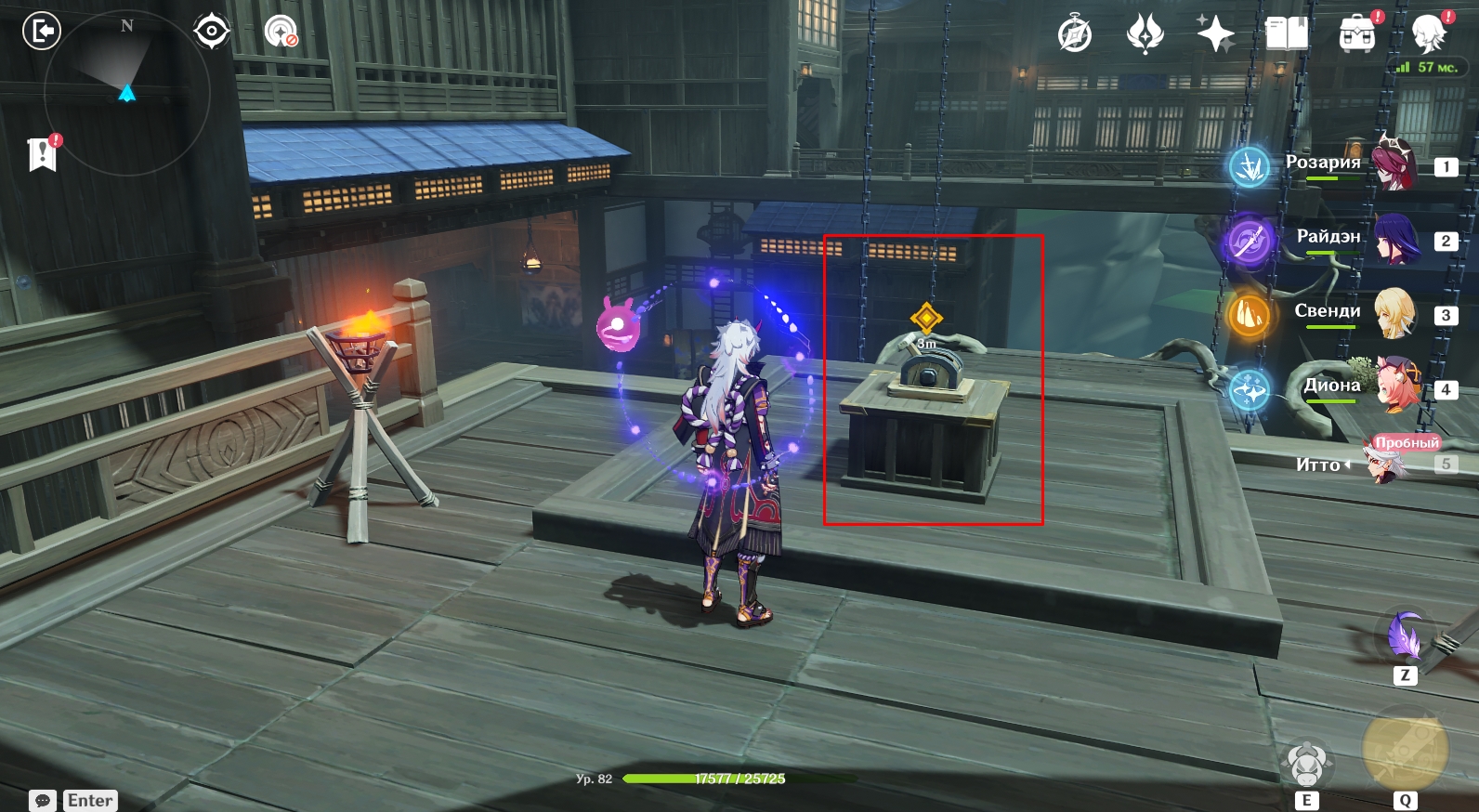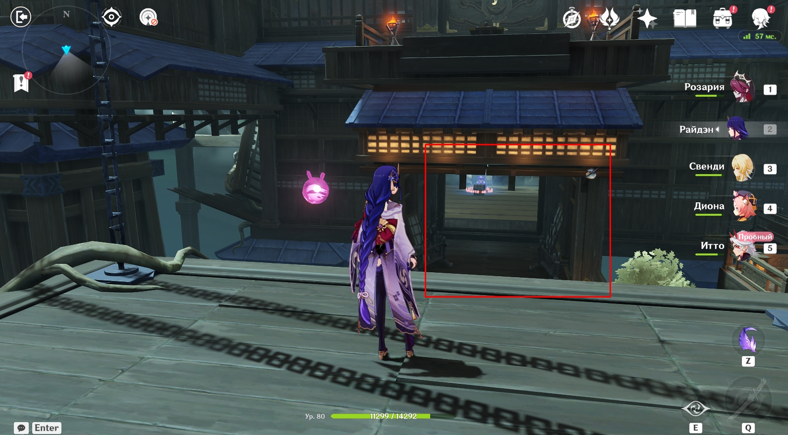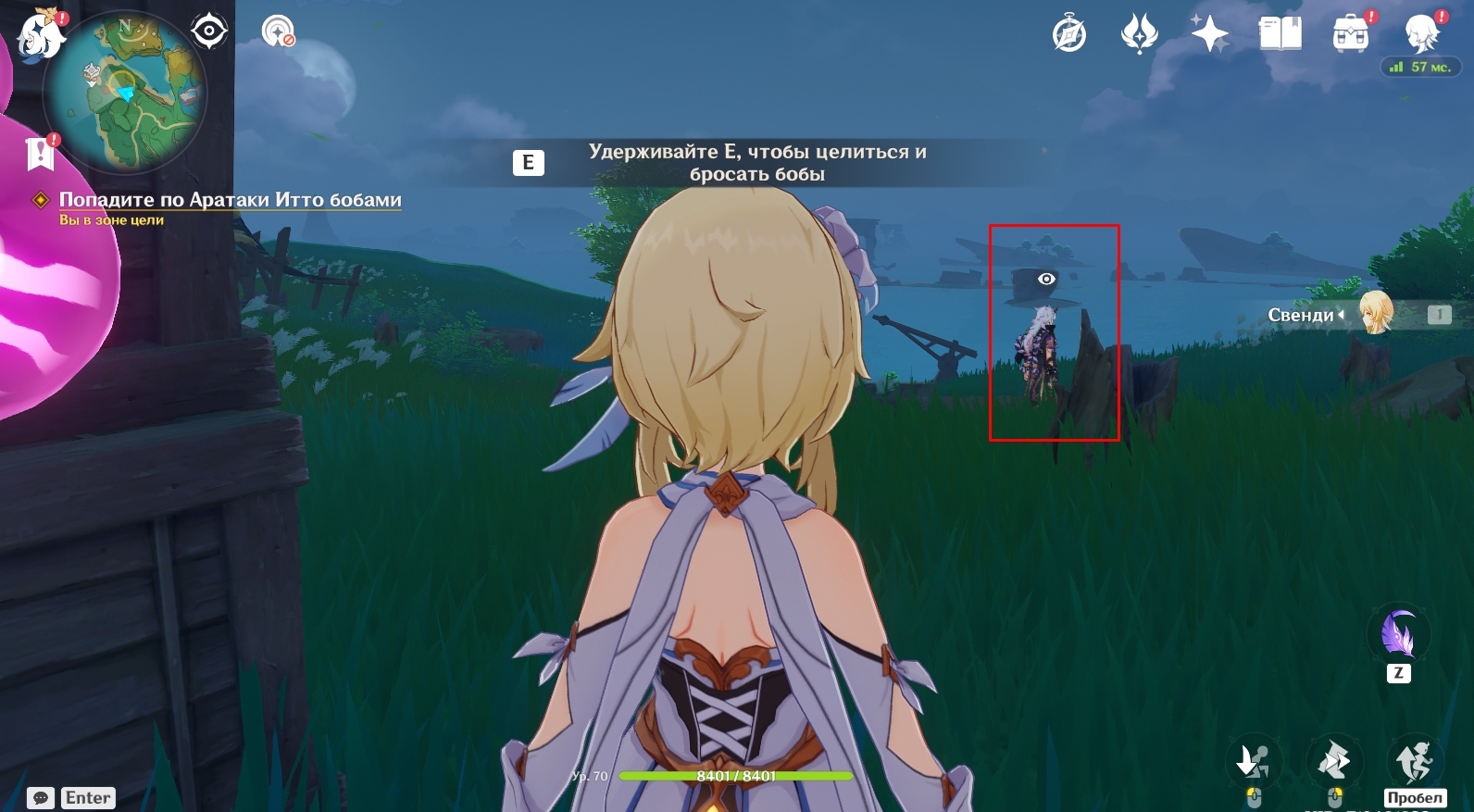 - Телепортируйтесь на Ясиори, использовав для перемещения вход в подземелье Поместье формации. На месте примените чувство стихий, чтобы обнаружить следы они. Пройдите по дороге вперед и увидите там Итто. Далее вам необходимо подойти к цели незаметно (присесть – ПКМ) и швырнуть в нее бобы, нажав кнопку Е для прицеливания. Следите за значком в виде глаза над головой Итто. Если он вас заметит, вокруг него появится красный индикатор. Когда круг вокруг глазика заполнится, они вас заметит и задание будет провалено. Придется начинать все сначала. Чтобы цель не заметила Путешественника, прячьтесь за преградами.