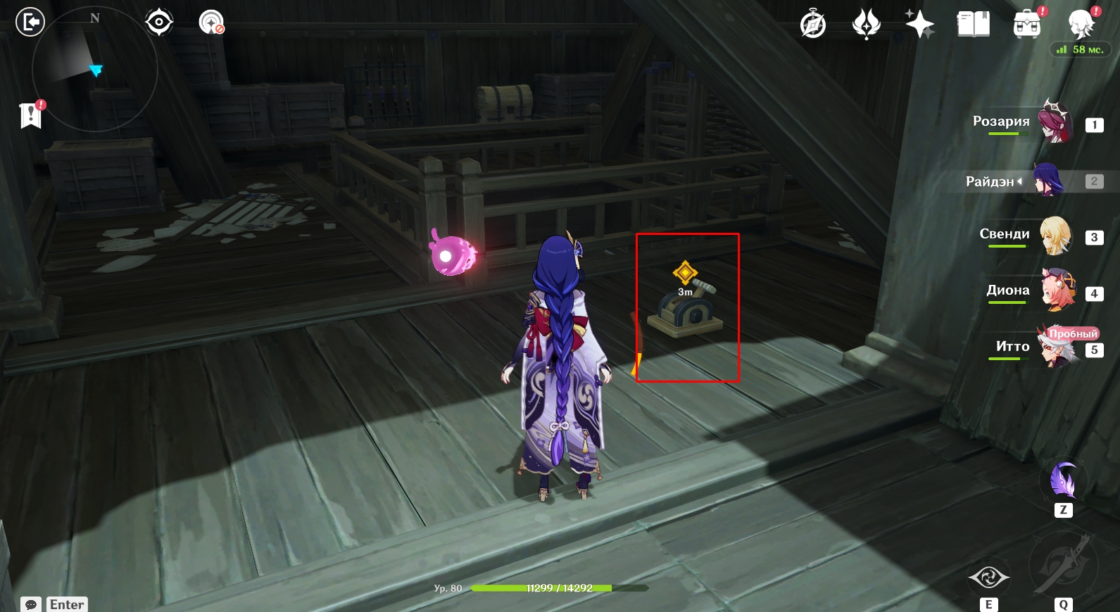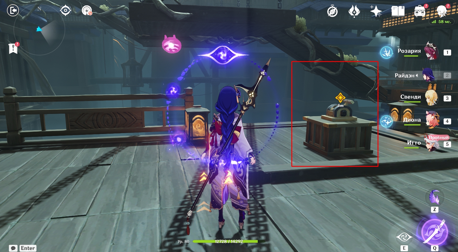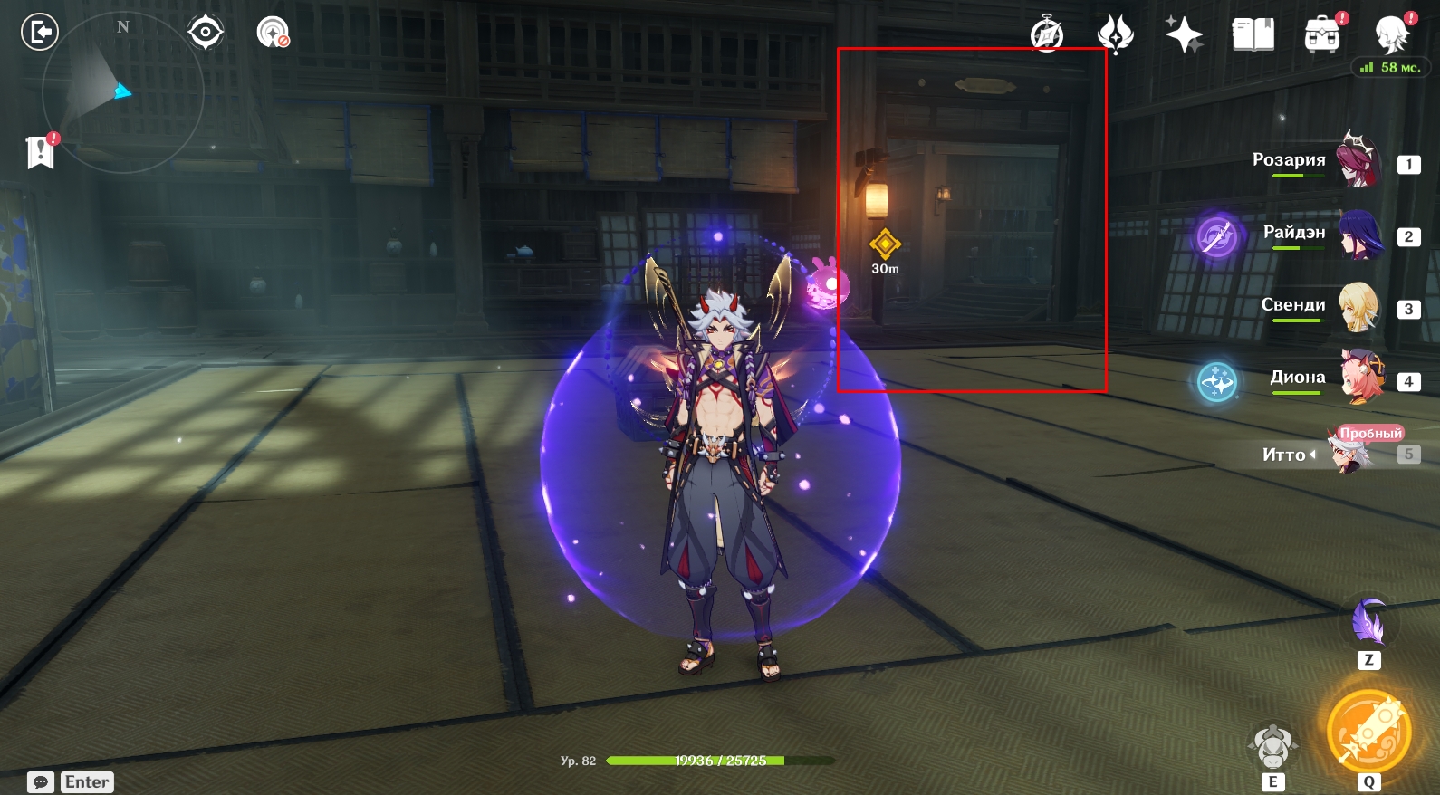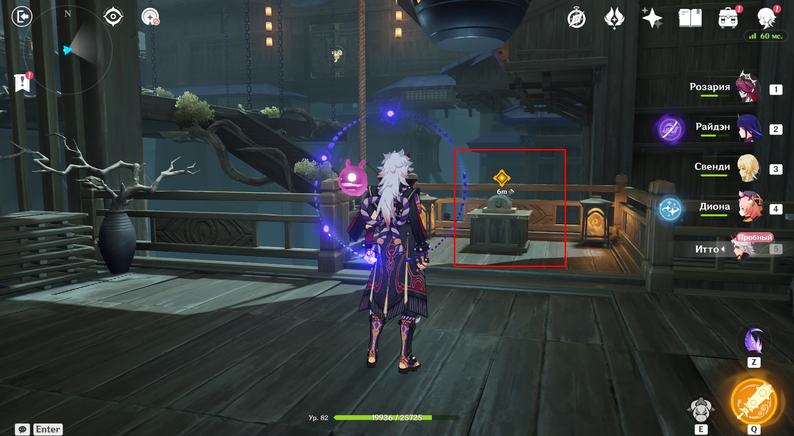 - Телепортируйтесь на Ясиори, использовав для перемещения вход в подземелье Поместье формации. На месте примените чувство стихий, чтобы обнаружить следы они. Пройдите по дороге вперед и увидите там Итто. Далее вам необходимо подойти к цели незаметно (присесть – ПКМ) и швырнуть в нее бобы, нажав кнопку Е для прицеливания. Следите за значком в виде глаза над головой Итто. Если он вас заметит, вокруг него появится красный индикатор. Когда круг вокруг глазика заполнится, они вас заметит и задание будет провалено. Придется начинать все сначала. Чтобы цель не заметила Путешественника, прячьтесь за преградами.