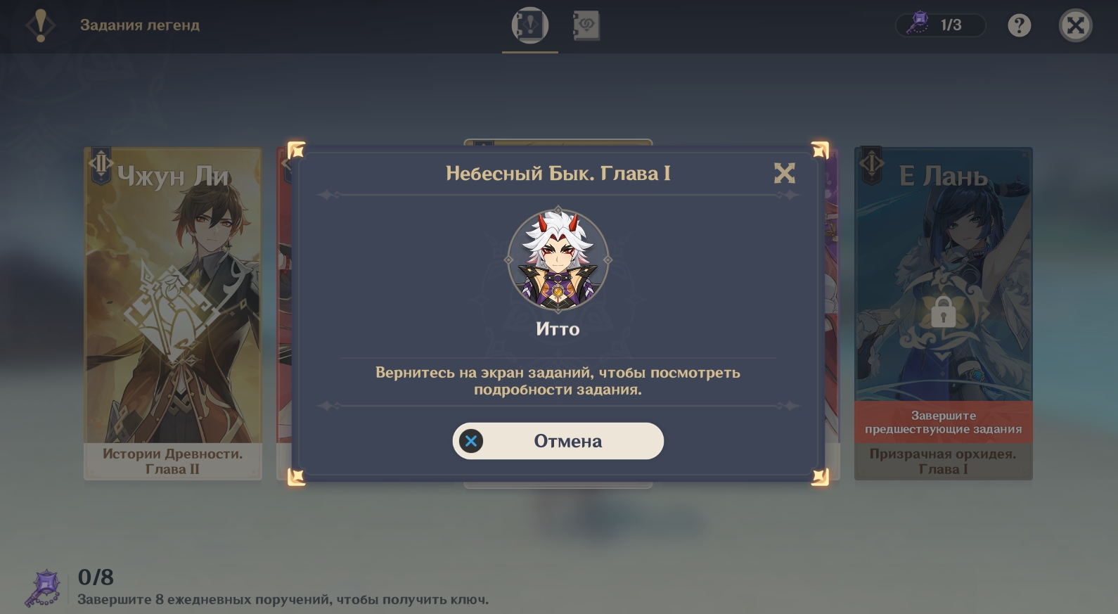 Здесь мы расскажем вам о прохождении сюжетных квестов Аратаки Итто и Райдэн. Чтобы получить задание конкретного героя, откройте журнал заданий –> выберите «Задания легенд» –> разблокируйте нужный квест. Помните, что у вас в запасе должны быть ключи (всего 2 ключа для двух героев или 3, если вы еще не прошли 1 Главу заданий легенд Райдэн). Если вы решили открыть событие через Базовый режим, можете сразу перейти к следующему разделу нашей статьи.