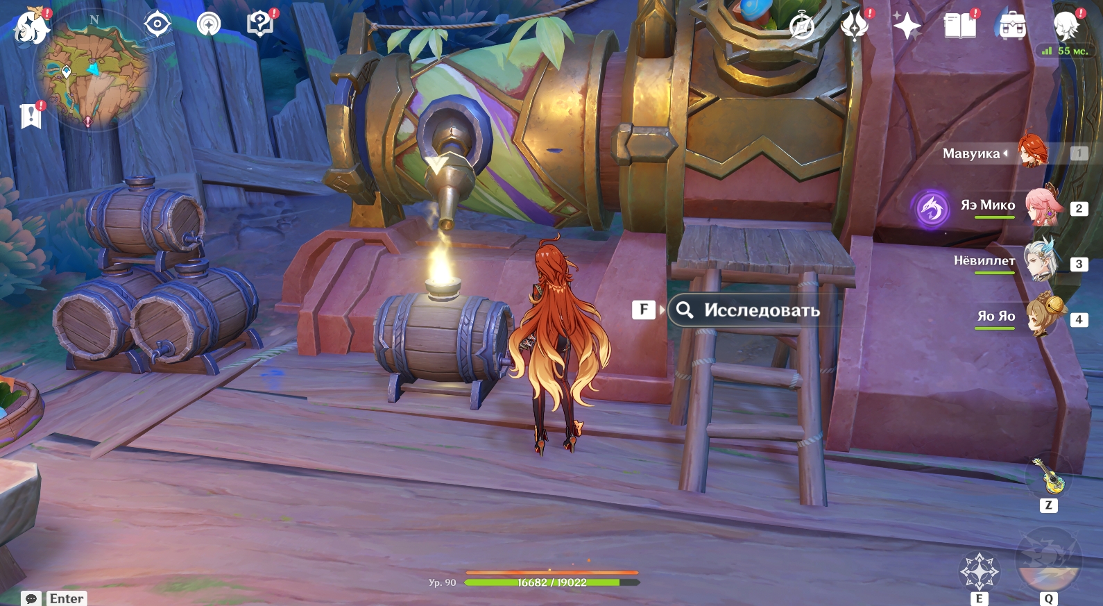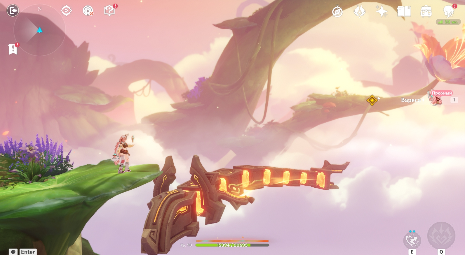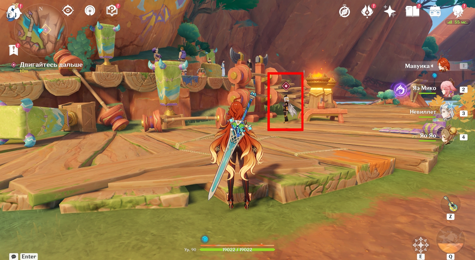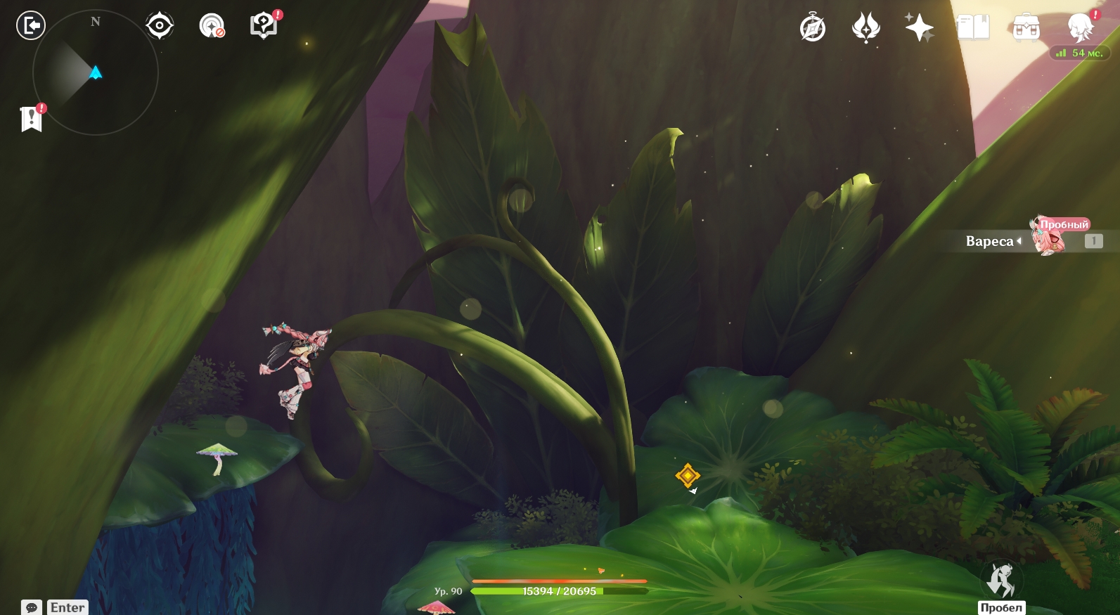 Добравшись до места, где парит Статуя дракона тайного источника, запрыгните на нее, чтобы добраться до следующей части локации. Когда вы спрыгните с механического существа, запустится кат-сцена, в которой покажут, как Вареса, Путешественница и Паймон догнали Грибного владыку и все-таки узнали его тайну. Однако ему в этот раз ему удастся тоже ускользнуть. Заберите награду из драгоценного сундука и продолжите преследовать существо.