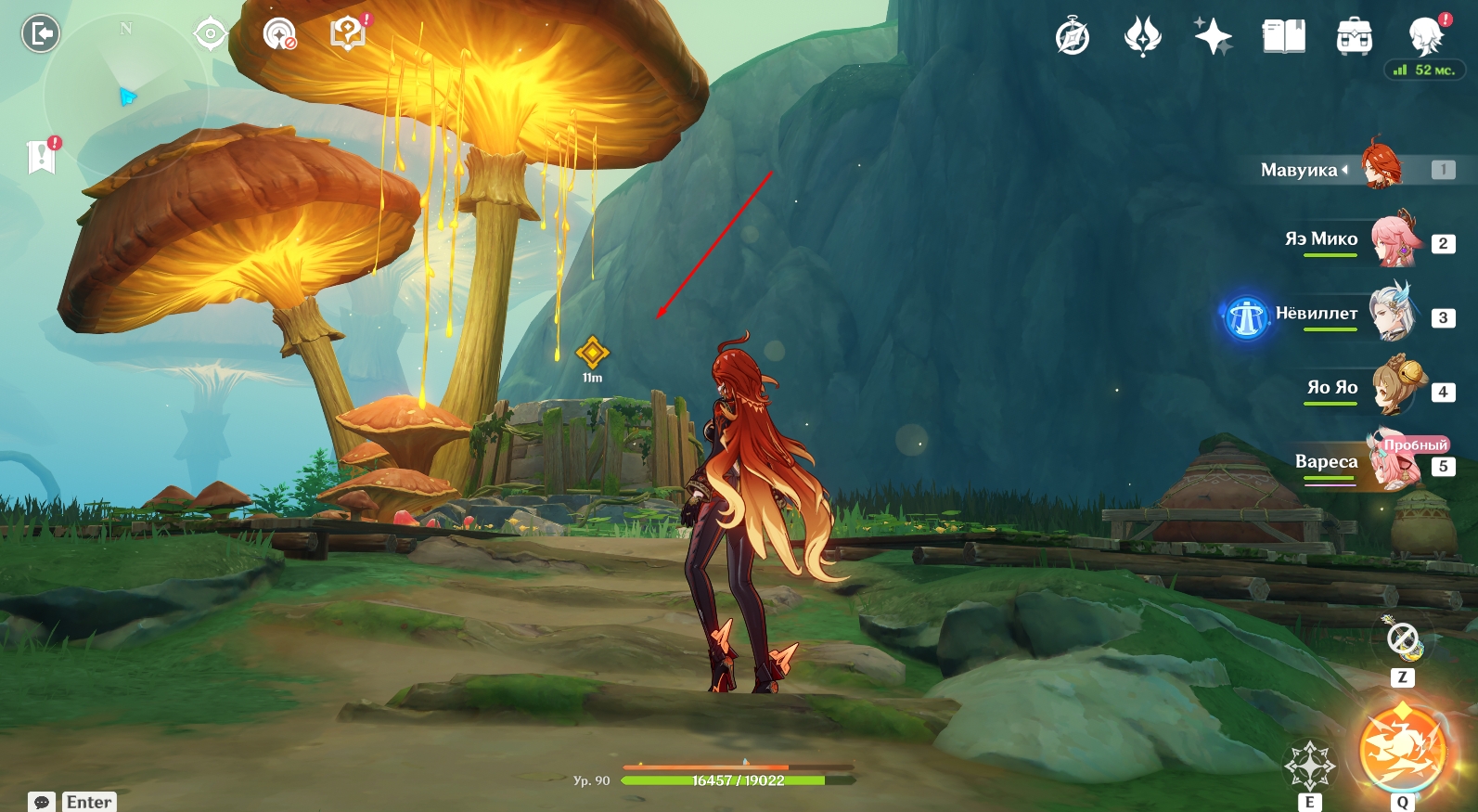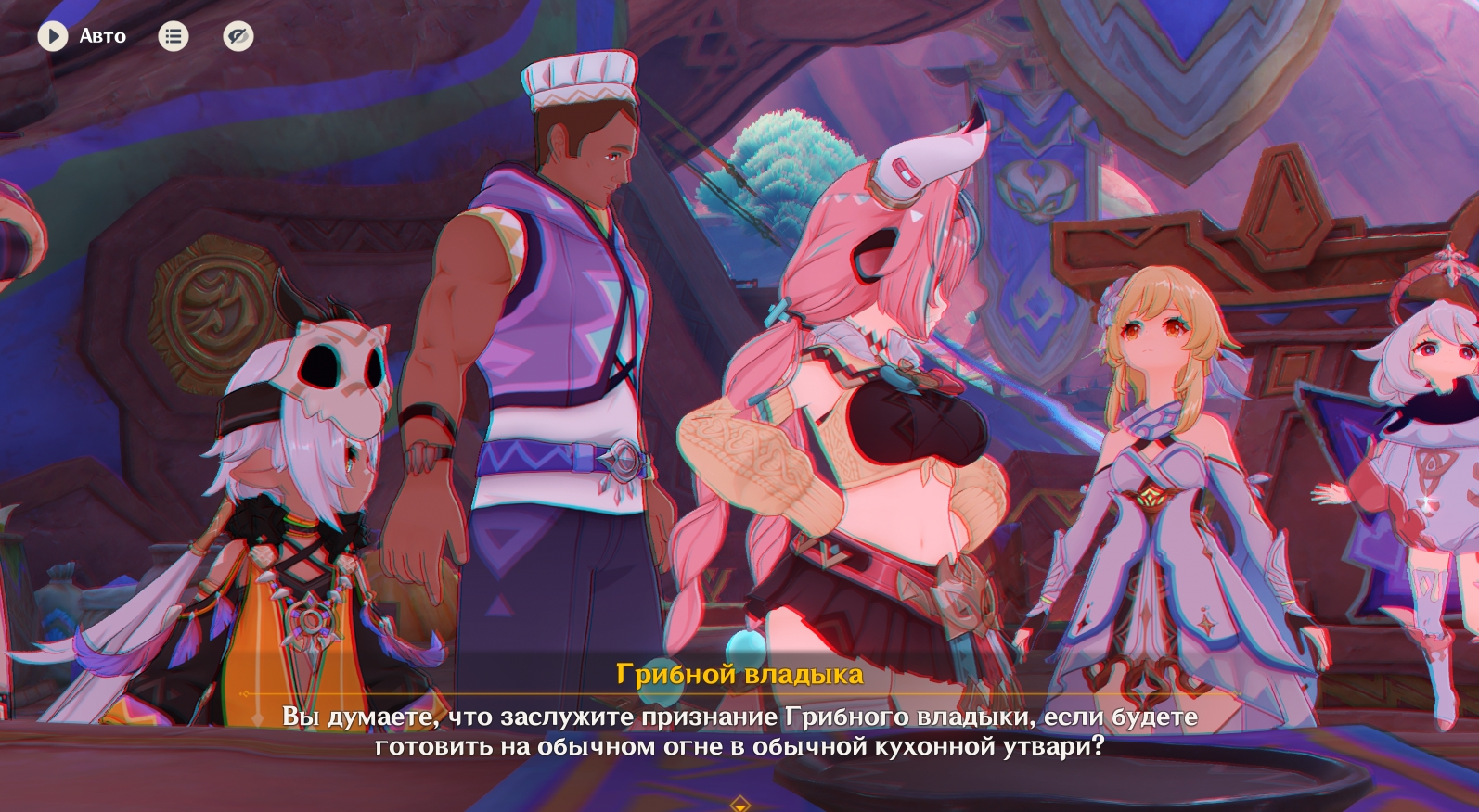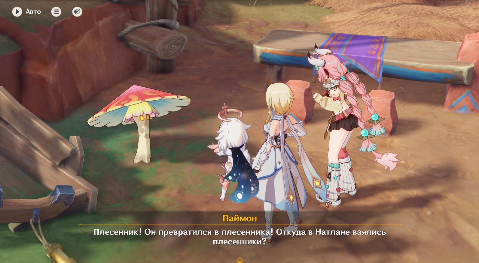 Далее идите на площадку, где будет проходить пиршество, и займите свое место: сядьте на отмеченный маркером стул. Это действие запустит долгожданное мероприятие. Все, что вам останется сделать – посмотреть кат-сцену и нажать любые диалоговые строчки. Под конец Атолли расскажет о странных зеленых грибах, которые по рекомендациям ученых из Сумеру нужно съедать как можно быстрее, и попросит сходить в сад Варесы за новой порцией грибов. Путешественница и Паймон согласятся помочь повару и заодно попытаются узнать больше о загадочных зеленых грибах.