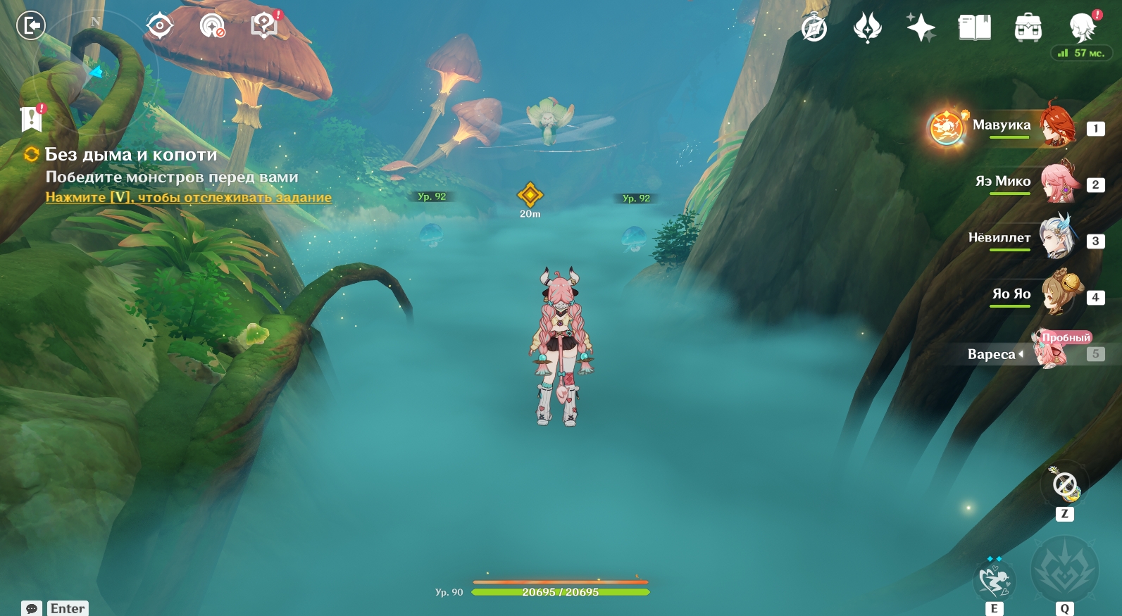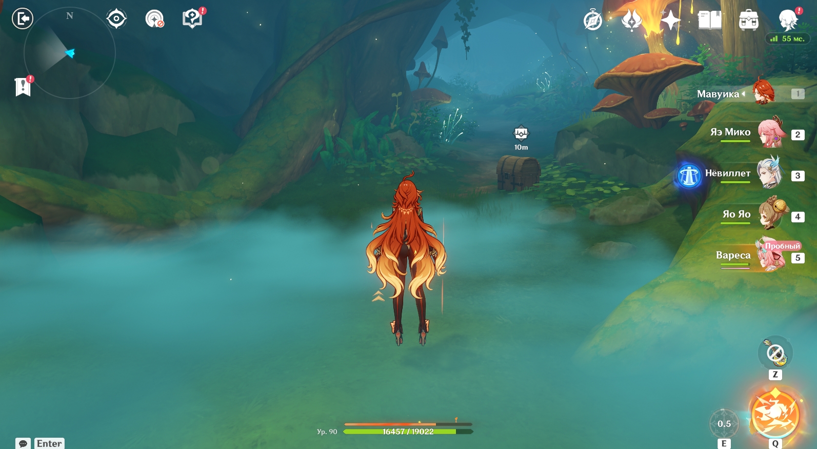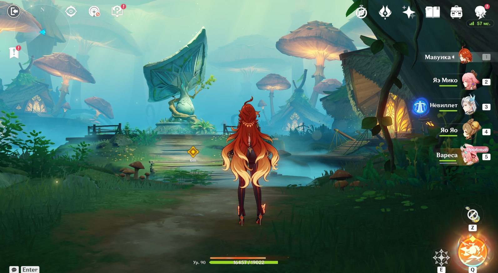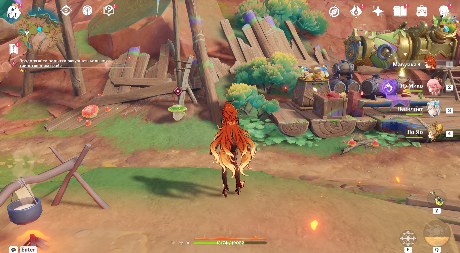 Отправляйтесь в поселение Удела Благодатных Земель и узнайте, как идет подготовка к ритуалу. Они сообщат, что все готово, и приступят к приготовлению блюда. В этот раз все получится. Когда кат-сцена закончится, Вареса, Путешественница и Паймон перенесутся в странное место, заполненное гигантскими грибами, где наконец-то встретятся с тем самым Грибным владыкой. После разговора с ним вам нужно победить нескольких плесенников. Затем обыщите обычный сундук и продолжайте идти вглубь пещеры.