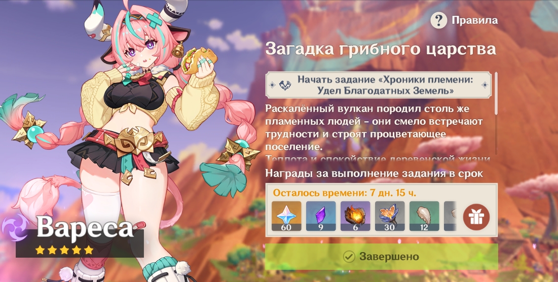 После забавного ролика переместитесь на Стадион Священного пламени и поговорите с Катериной. Она приведет Тигнари, который расскажет все, что знает о Грибном владыке. После беседы с ним задание «Шепот грибов на полях» и вся цепочка Хроник Удела Благодатных Земель подойдут к концу. Вот какие награды вы получите: