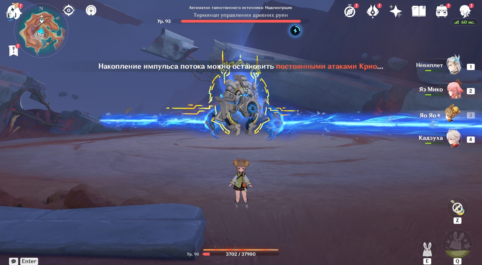 Даже если вы избежите лучей, Импульс потока все равно будет накапливаться пассивно – по 2 очка в секунду. Однако можно уменьшить запас Импульса потока на 4 очка, атакуя противника Крио атаками.