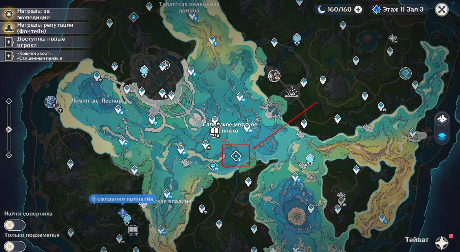 Если вы не знаете, где найти Всепожирающего нарвала в Genshin Impact, посмотрите изображение ниже. На нем отмечено местоположение входа в Тень другого мира и самого босса в Фонтейне. Чтобы попасть в это место, откройте карту подводной локации региона и кликните по значку подземелья, после чего выберите «Телепорт».