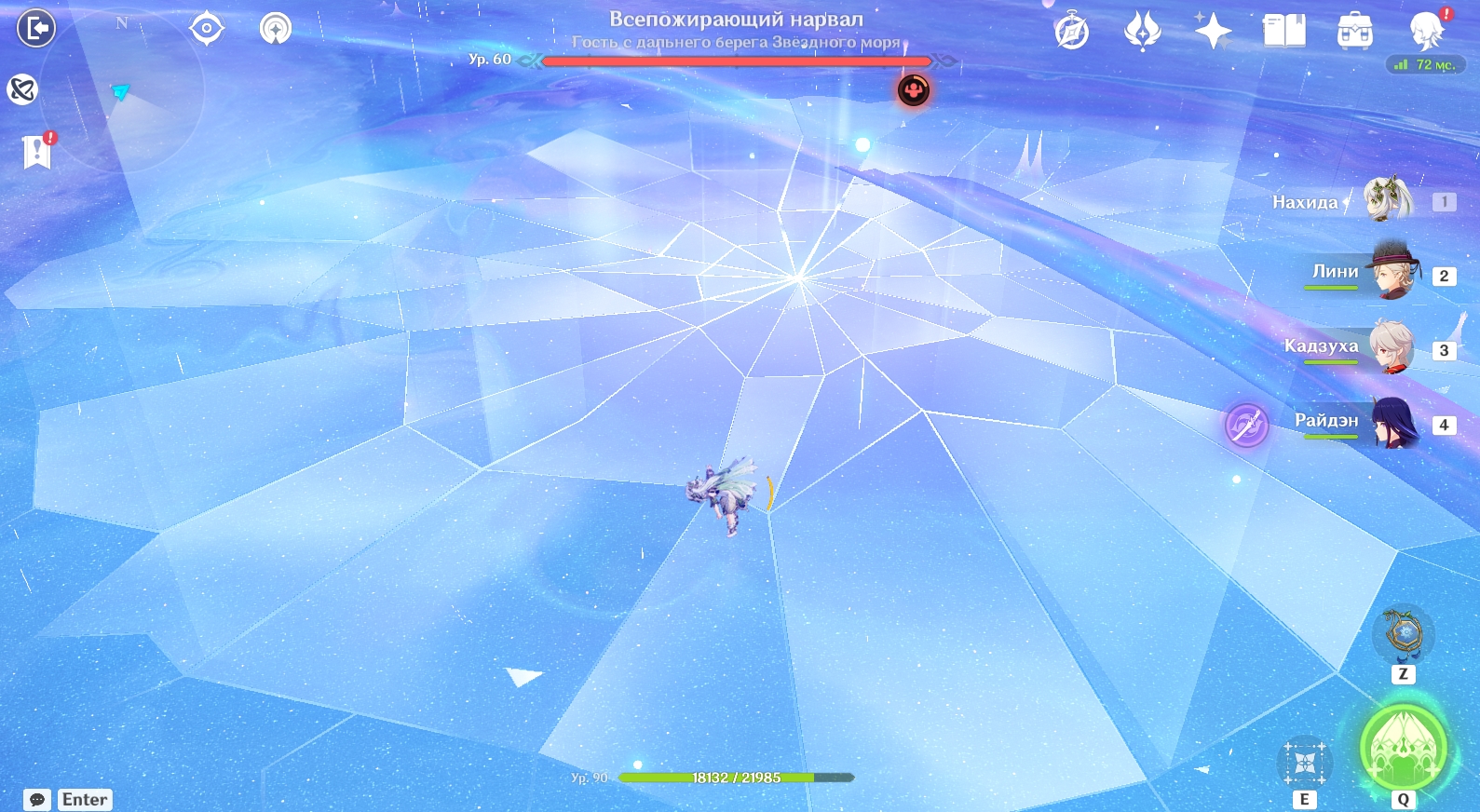 - Выныривание с прыжком. На площадке под героем появляется большая область с трещинами, после чего из нее выпрыгивает Всепожирающий нарвал. В этот момент он наносит АОЕ-урон от Гидро. Через короткое время рядом с треснувшим местом появляются водные брызги. Они тоже наносят АОЕ-урон от Гидро.