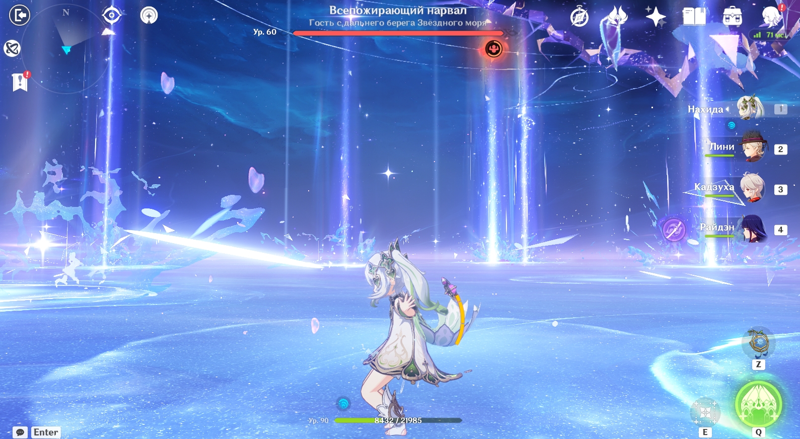 - Астральный ливень. Босс создает лучи света, которые падают на площадку и многократно наносят АОЕ-урон от Гидро.