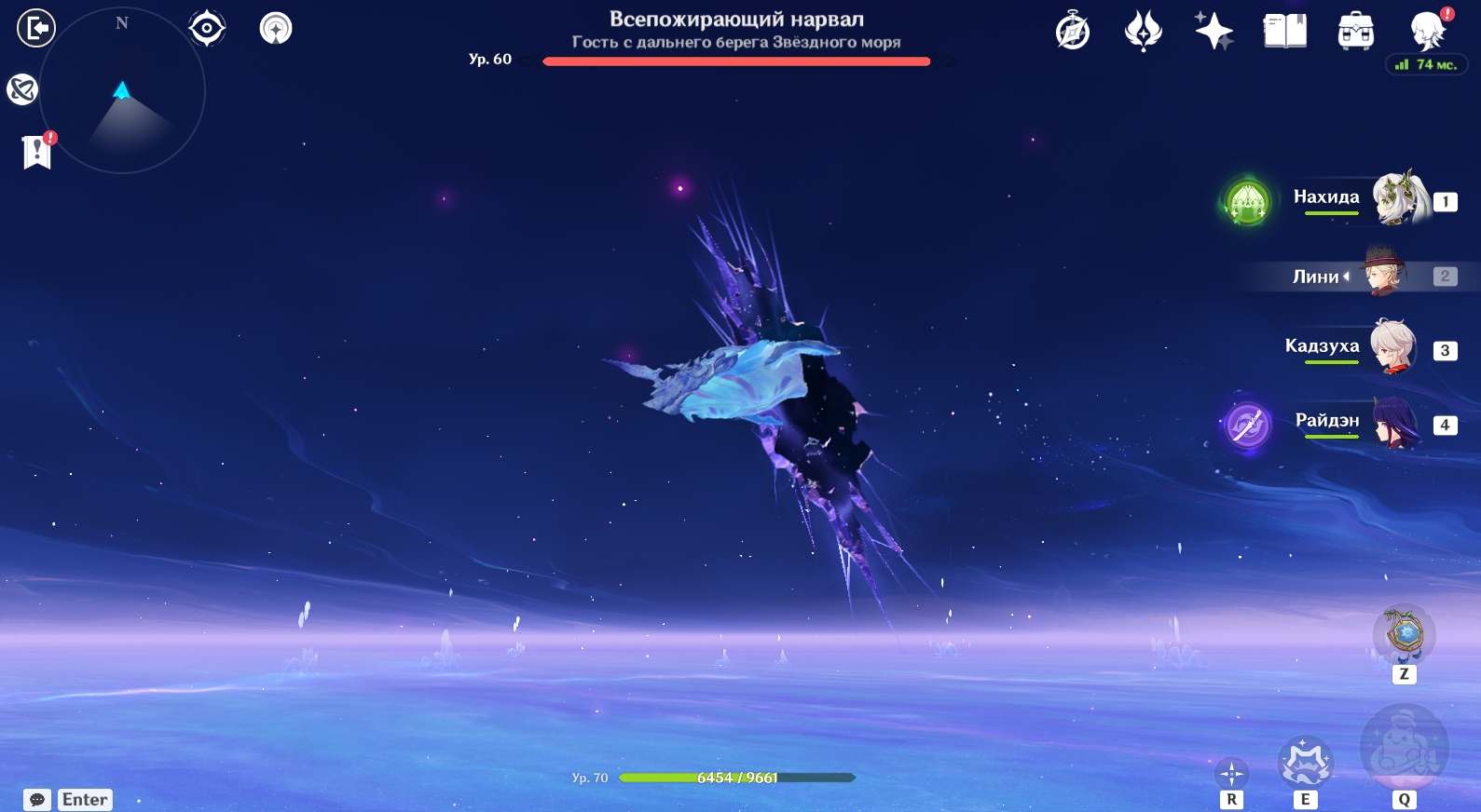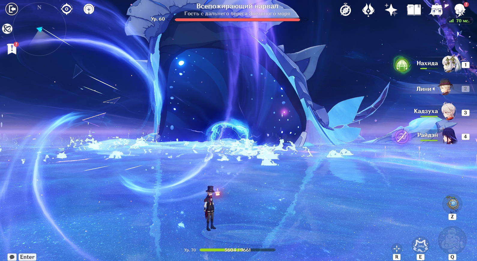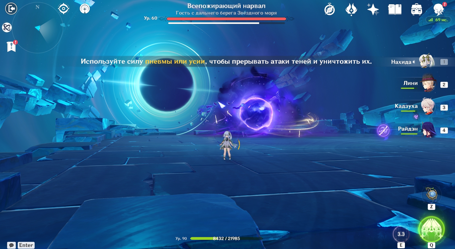 Вторая фаза сражения происходит в другом месте – в брюхе Всепожирающего нарвала. На данном этапе вам нужно победить Рыцаря Бездны (Электро). Вот какие способности он использует: