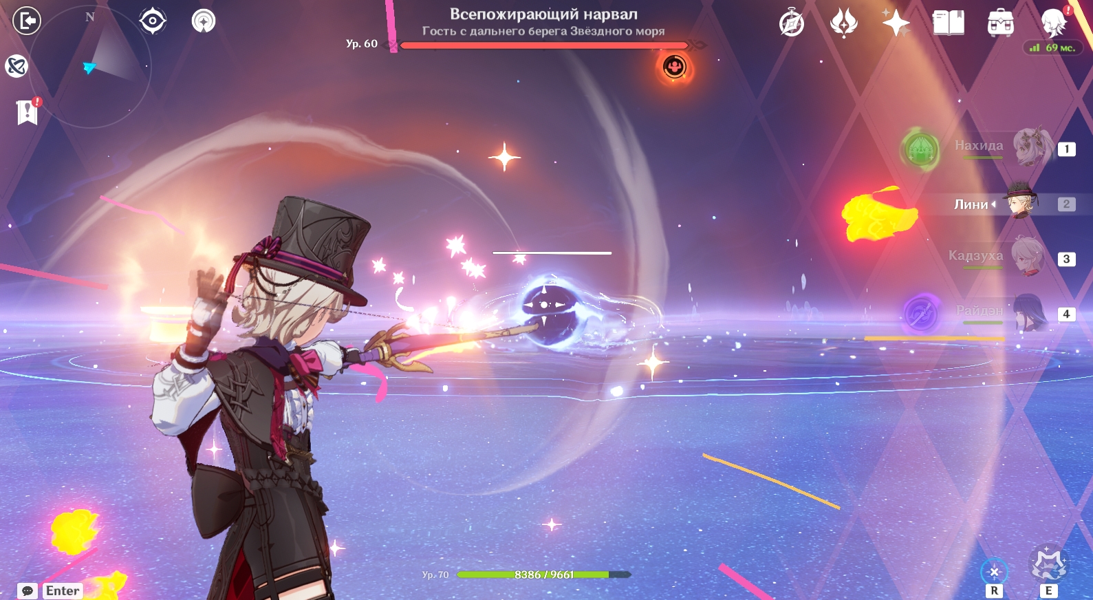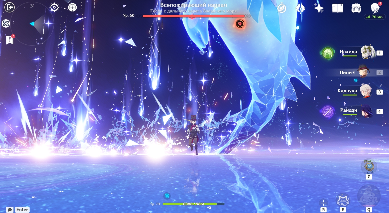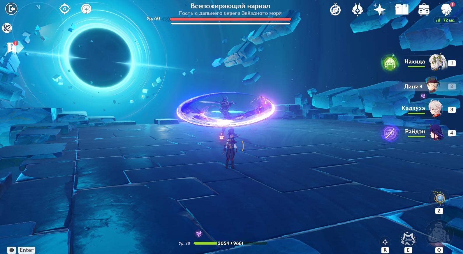 Вторая фаза сражения происходит в другом месте – в брюхе Всепожирающего нарвала. На данном этапе вам нужно победить Рыцаря Бездны (Электро). Вот какие способности он использует: