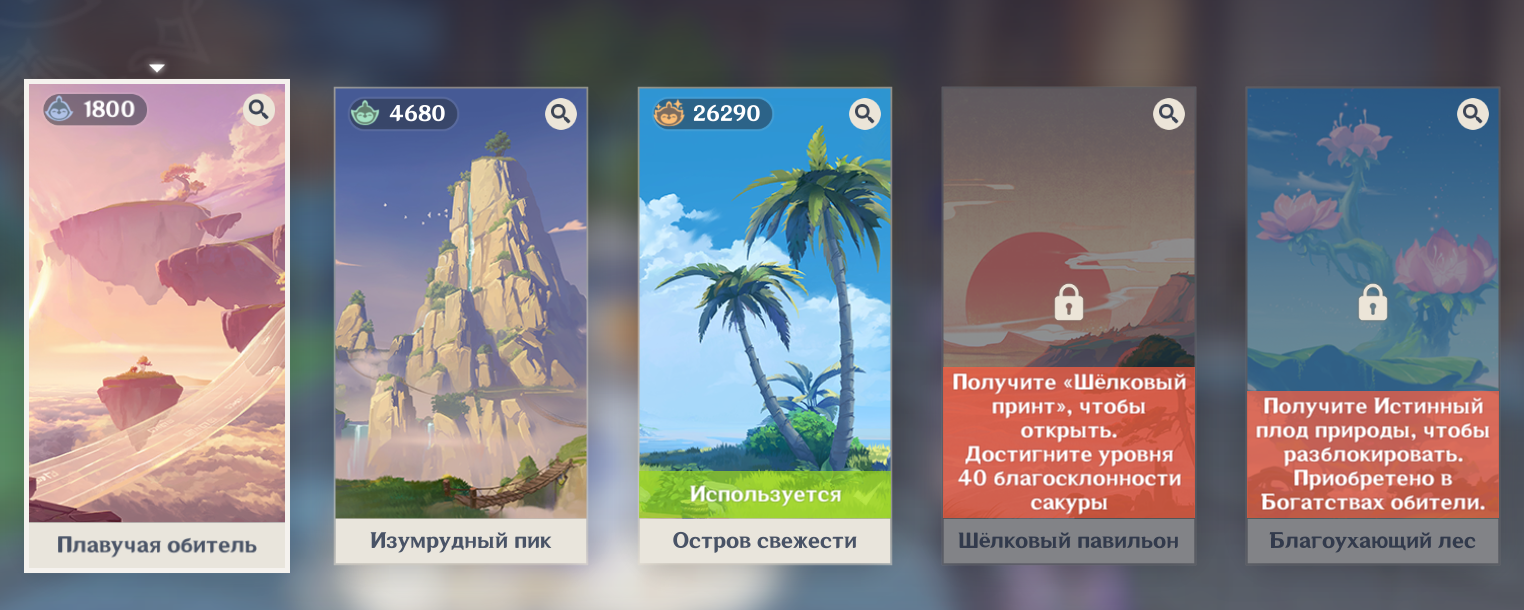 К примеру, если у в вашем жилище активна форма «Остров свежести», то вы не сможете использовать шаблон с формой «Плавучая обитель», «Изумрудный пик», «Шелковый павильон» или «Благоухающий лес». Эти же правила применяются и к шаблонам дизайна главных зданий (домов).