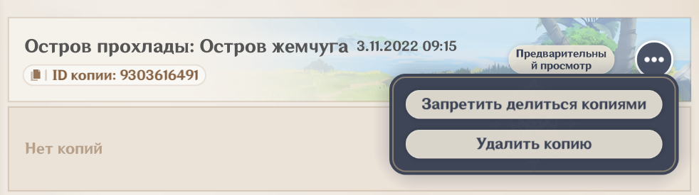 После записи шаблона в разделе «Копии» появится ваш сохраненный вариант дизайна Чайника безмятежности. Слева указан его ID, который можно скопировать, кликнув по нему. В выпадающем меню справа (три точки) есть настройки шаблона: «Удалить копию» и «Запретить делиться копиями». Также вы можете посмотреть шаблон, нажав на кнопку «Предварительный просмотр».