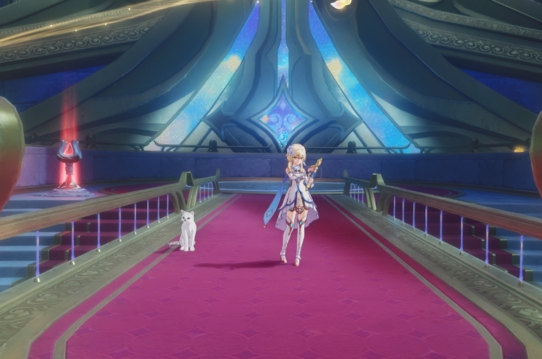 Взаимодействуйте с центром площадки, где вы сражались с големом-кентавром, чтобы попасть на второй этаж дворца. На краю балкона вы увидите арфу. Прикоснитесь к ней, чтобы сыграть Реквием. В процессе игры на арфе вам нужно следить за подсказками на экране и вовремя нажимать на подсвеченные ноты.