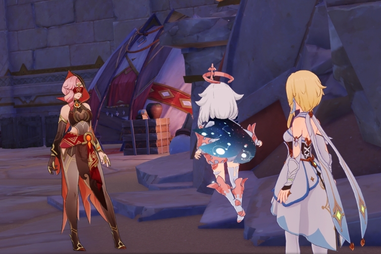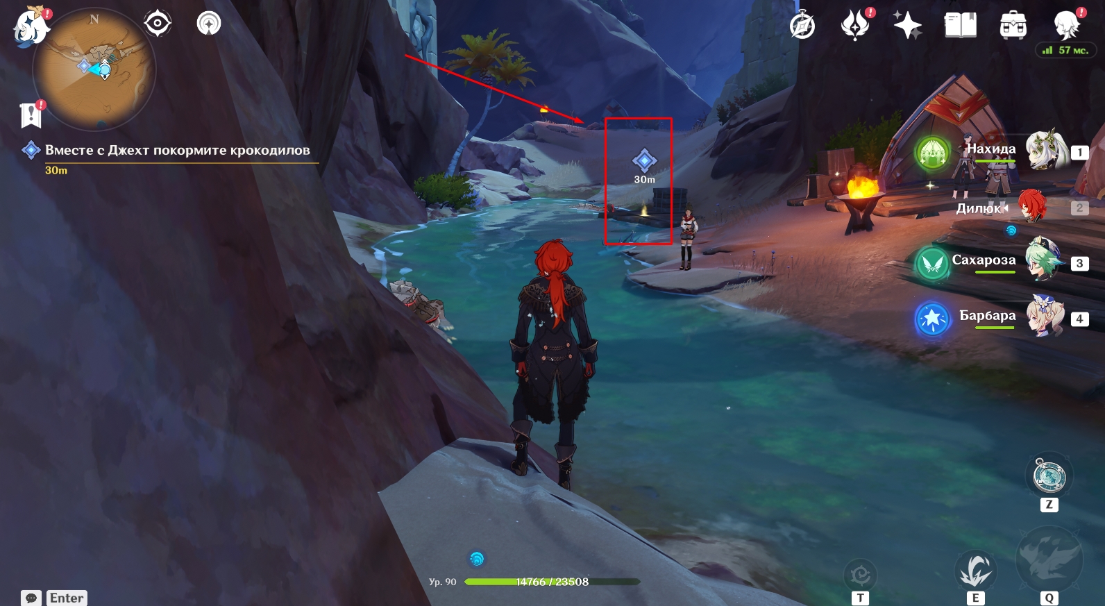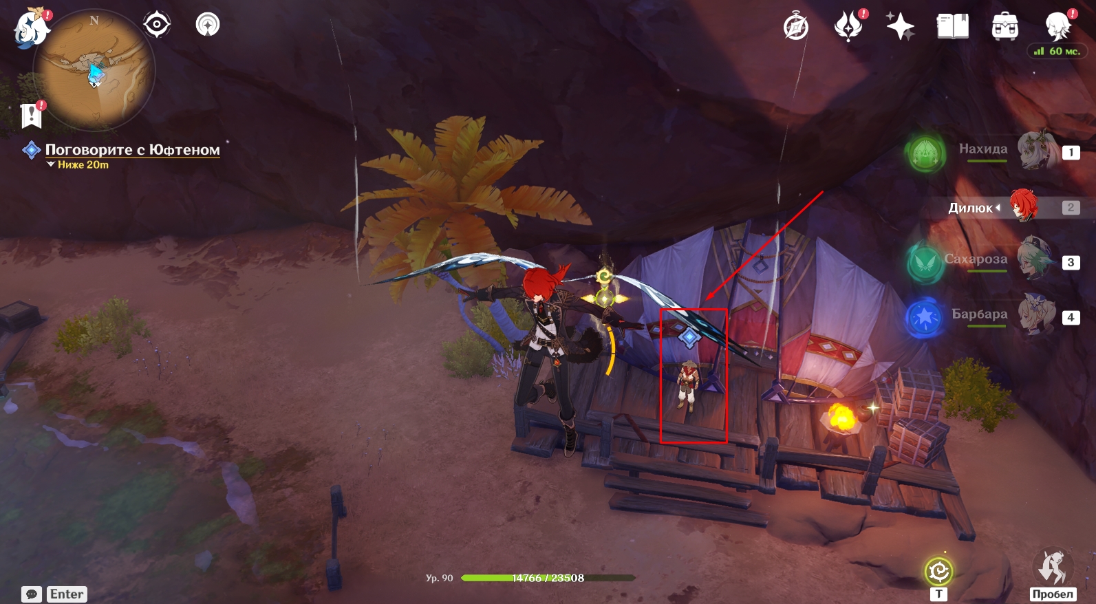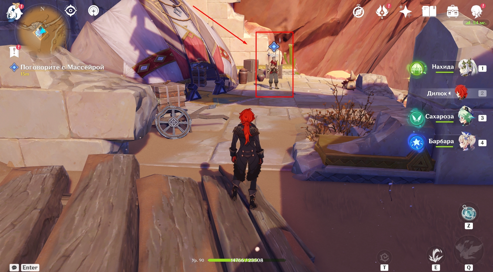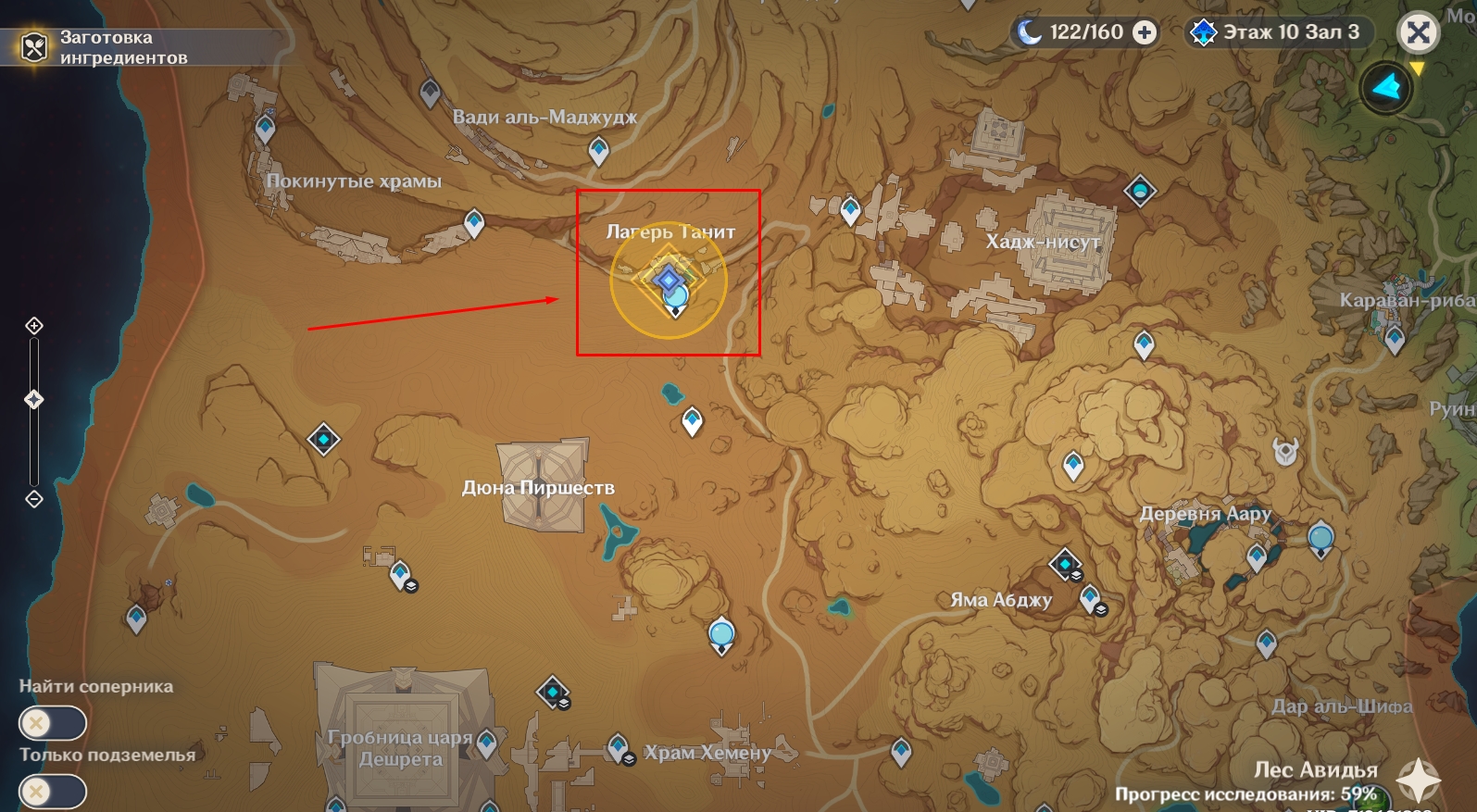 Лагерь Танит является частью Пустыне Хадрамавет. Если данная область Сумеру вами еще не исследована, то быстрее всего вы доберетесь до указанного места с помощью телепорта на северо-востоке от Дюны Пиршеств в Море красных песков (см. скриншот ниже). Чтобы запустить диалоговую сцену, просто подойдите к краю ущелья.