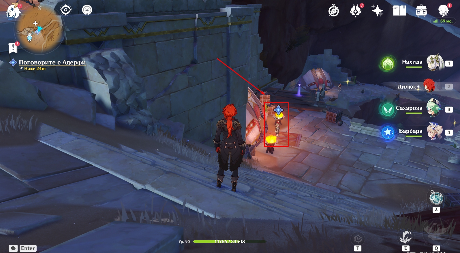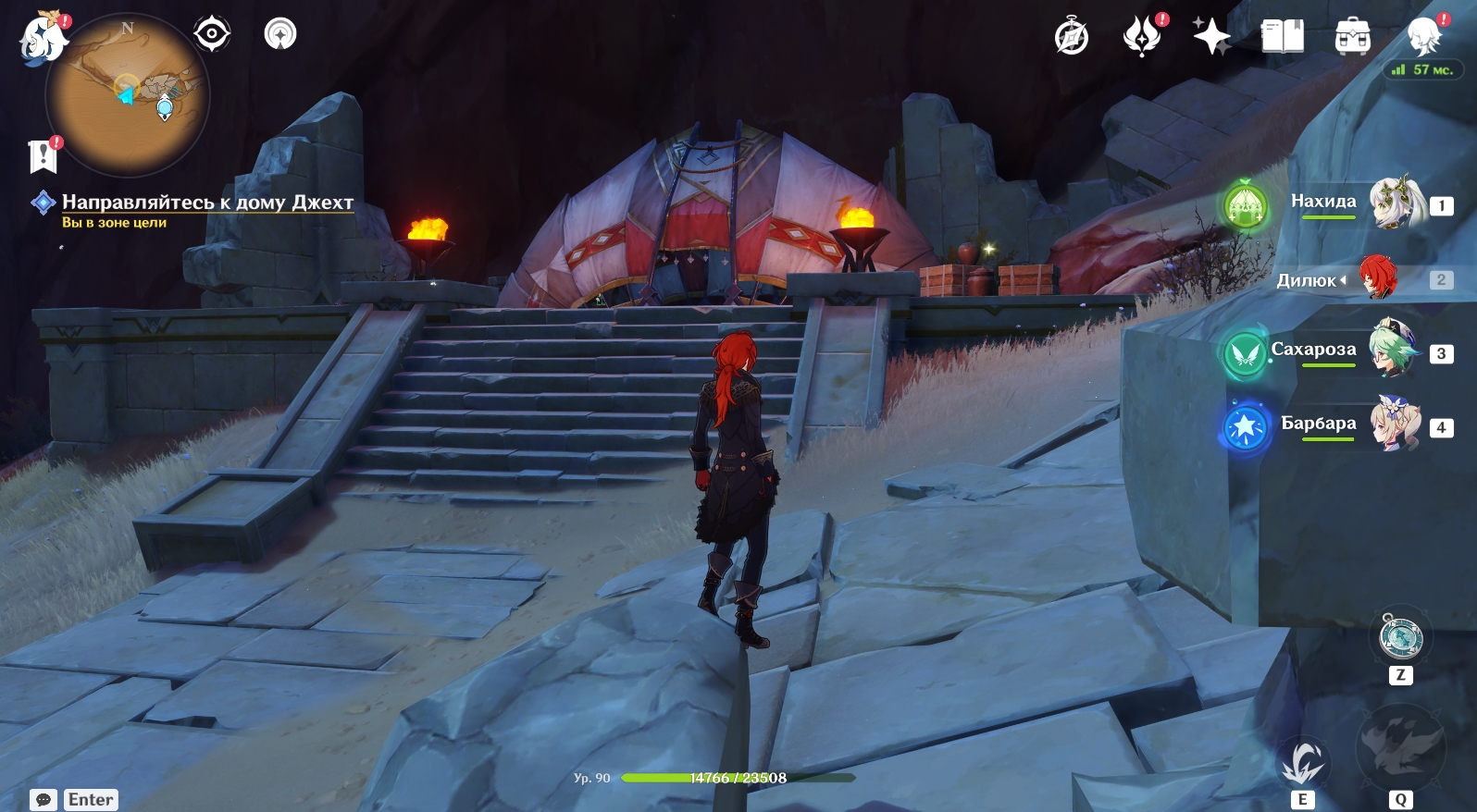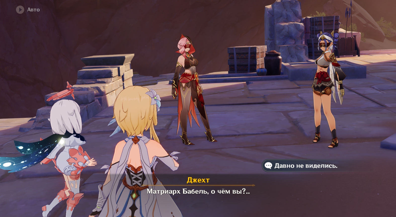 Ваша первая цель находится в столице Сумеру. Переместитесь к телепорту на юге города и поговорите с Катериной, секретарем Гильдии искателей приключений. От нее вы узнаете, что Джехт прислала Путешественнице письмо. В нем девушка-пустынница пишет, что сейчас находится в лагере Таннит и ей очень нужно встретиться с главной героиней.