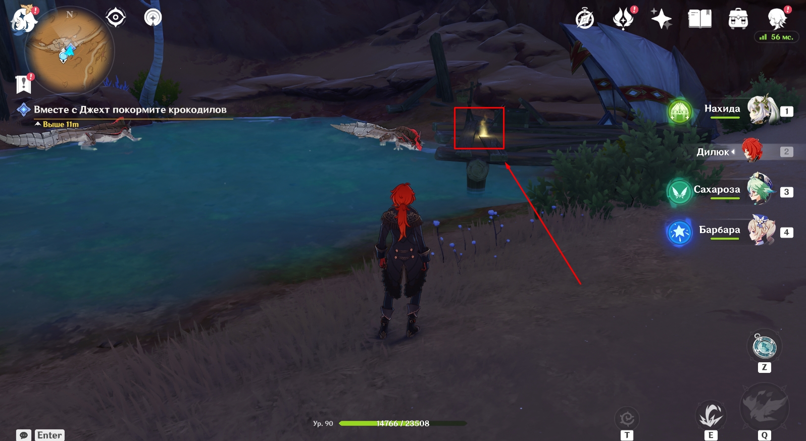 Когда Бабель уйдет, Джехт расскажет о своей жизни после событий в Море красных песков и даст вам первое поручение – помочь Юфтену покормить крокодилов. Спуститесь к водоему и поговорите с мужчиной, а после повернитесь налево и подойдите к желтому свечению на деревянной платформе. Когда кат-сцена завершится, пройдите вдоль реки к следующему желтому свечению. Потом идите к Юфтену и отчитайтесь о проделанной работе.