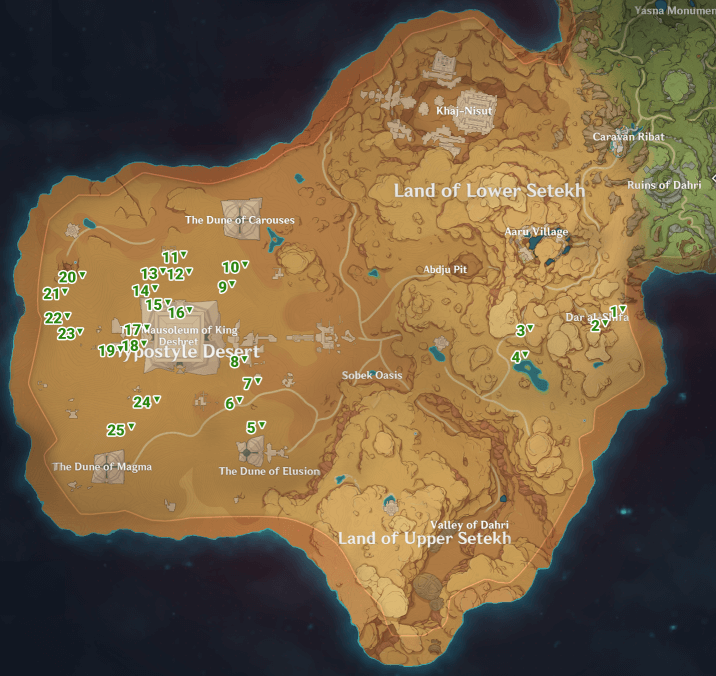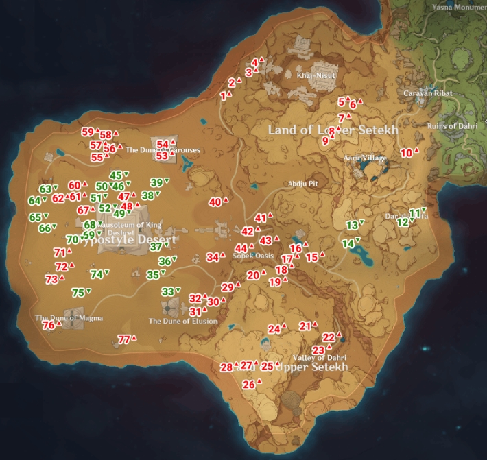 Чтобы вам было намного проще найти всех Скарабеев в пустыне, мы рекомендуем воспользоваться официальной интерактивной картой Тейвата.