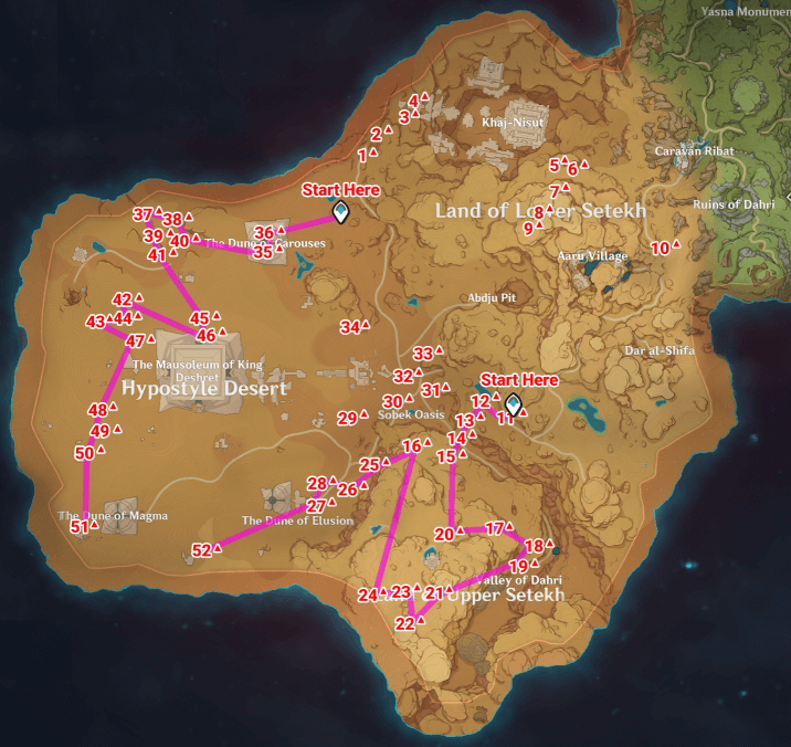 На изображении ниже мы отметили лучший маршрут сбора Скарабеев в Genshin Impact на поверхности. Он подойдет даже тем игрокам, которые еще не открыли подземную область пустыни. Следуя по нему, вы насобираете максимум 52 Скарабея.