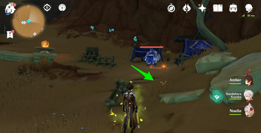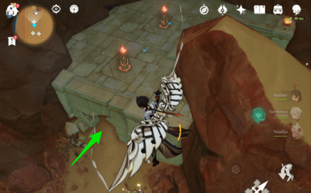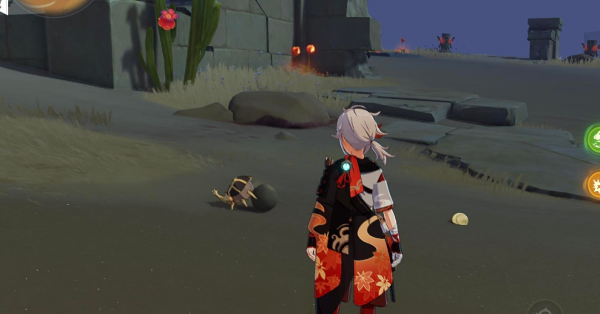 9-10 | Телепортируйтесь ко входу в подземелье Алтарь миражей, после чего пройдите через туннель. Используйте четырехлистный символ, чтобы добраться до верхнего выступа. Там будет три хиличурла, стоящих вокруг двух Скарабеев. Убейте монстров и заберите жучков | ![]() |