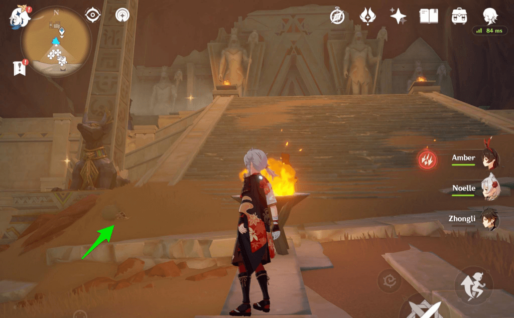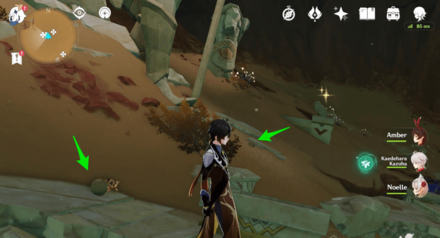 21 | Переместитесь к телепорту между Дюной Пиршеств и Гробницей царя Дешрета. Используйте четырехлистный символ и спуститесь по колонне в пещеру. Используйте ветряной поток, чтобы подняться выше и попасть в другой туннель. Минуйте Фатуи и заберите Скарабея возле баррикады | ![]() |