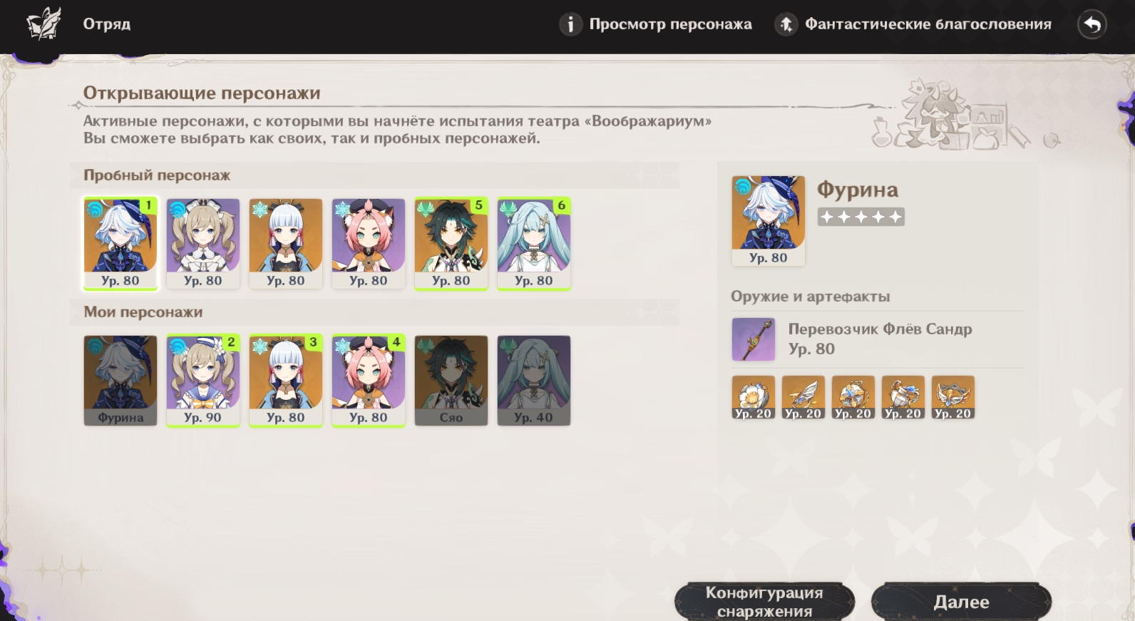 Также мы рекомендуем обязательно сохранить 1 лучника для боя с Драконом вечных бедствий, так как в рамках испытаний Театра «Воображариум» он будет постоянно летать над площадкой. Мы надеемся, что к этому моменту у вас будет 1 стак Усердия у Фурины, Сяо, Фарузан и любого целителя, поскольку этот отряд – лучший для 8 акта.