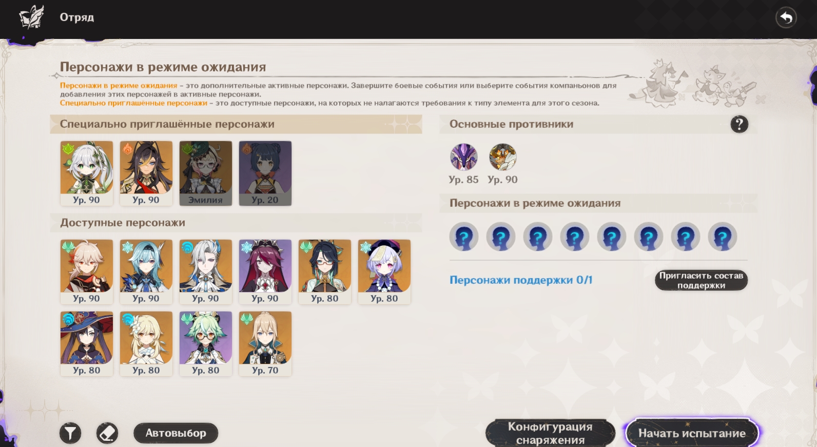 Обратите внимание на то, что альтернативные герои, находящиеся «В режиме ожидания», могут быть только стихий Крио, Анемо и Гидро. Если у вас нет персонажей, которые имеют нужный уровень прокачки для прохождения Театра «Воображариум», позаимствуйте одного у своих друзей. Хотите поделиться с другими игроками своими второстепенными героями? Добавьте лучших из них в список «Состав поддержки».