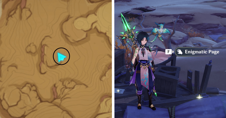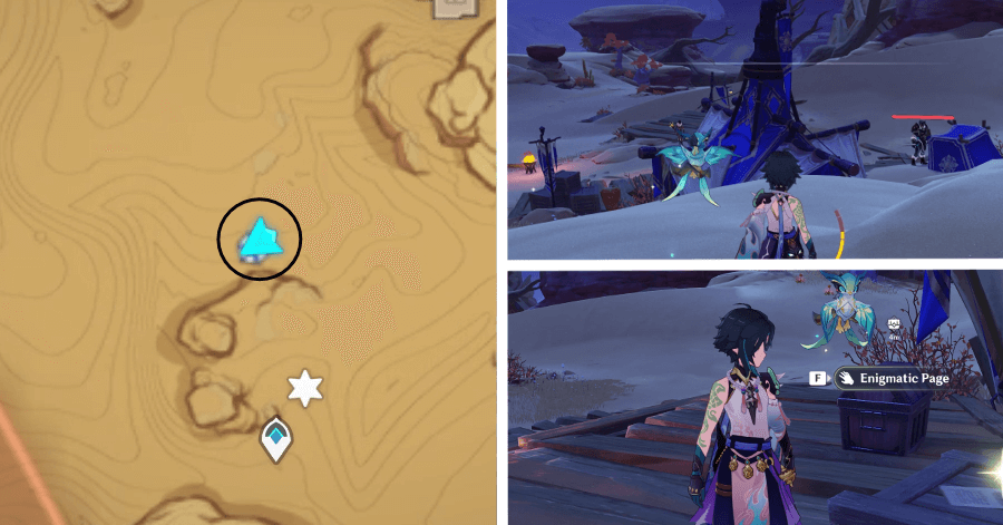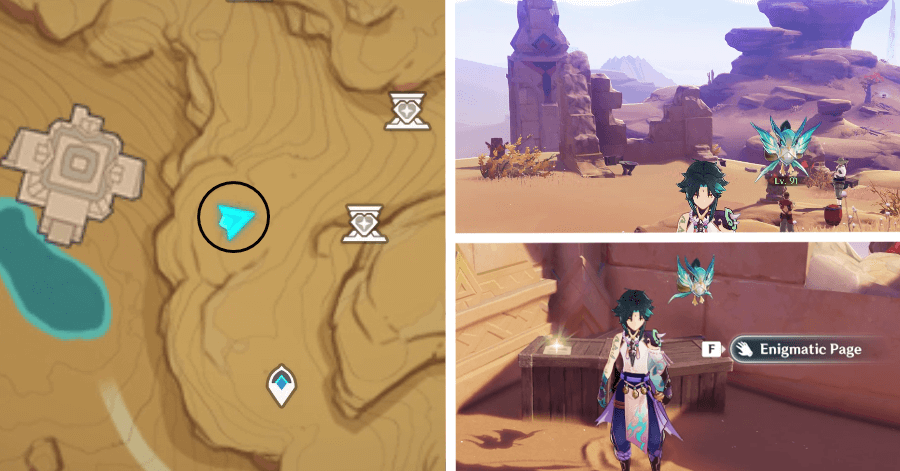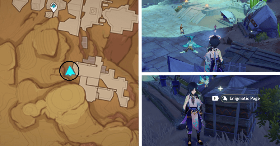 8 | Переместитесь к статуе Семи Архонтов в Земле верхнего Сетеха и идите на запад на вершину горы. Там вы найдете лагерь Пустынников с заблокированным богатым сундуком. Страница лежит на ящике слева от него.