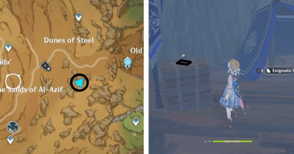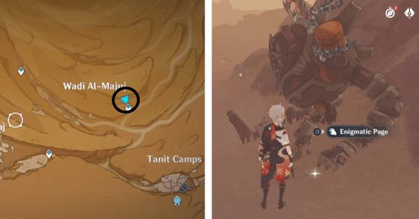 10 | Телепортируйтесь на юг Долины Дахри (телепорт слева от гигантского робота), пройдите немного вперед и найдите лагерь Фатуи с запертым сундуком. Рядом с ним на ящике лежит последняя страница из 4 Тома «Тысячи ночей» | ![]() |