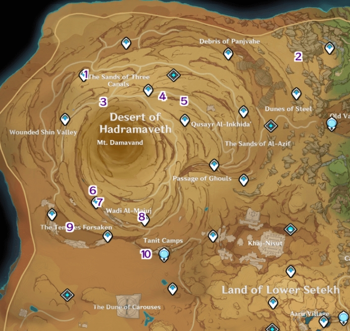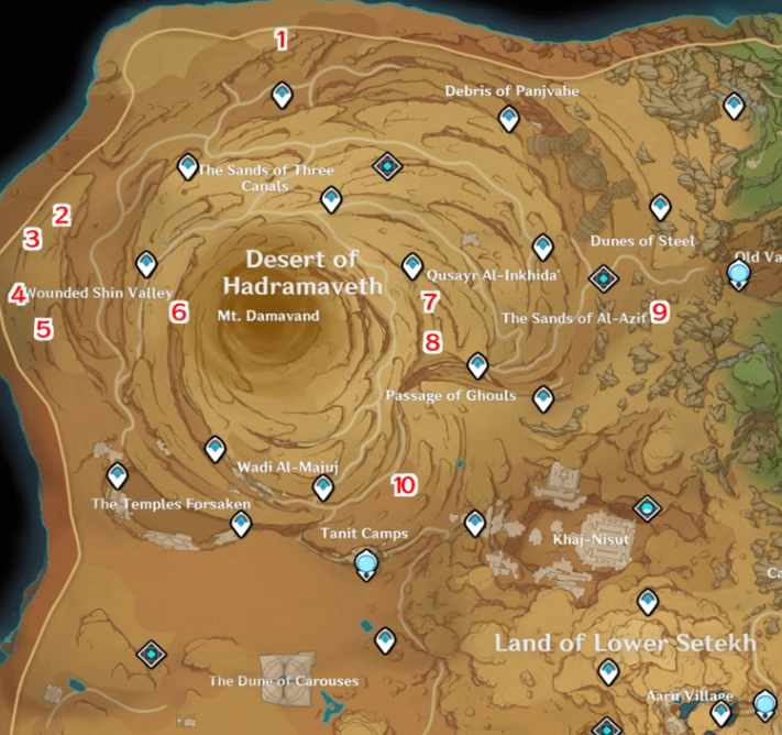 Процесс сбора загадочных страниц в Сумеру ничем не отличается от того, что вы делали в Инадзуме, когда искали части серии книг «Рассказы улицы Токи». Единственное отличие – не придется бегать по всему Дендро региону. Вырванные страницы из «Тысячи ночей» находятся на территории Моря красных песков и в Пустыне Хадрамавет. Однако, чтобы получить некоторые из них, нужно заранее разблокировать определенные скрытые зоны, такие как Гробница царя Дешрета, Храм Хемену, Сафхе Шатрандж и прочее.