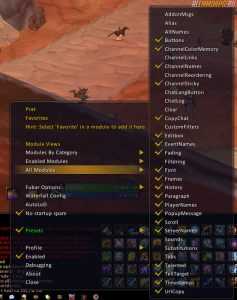 Аддон для визуальной настройки чата. Имеет множество подключаемых модулей для настроек чата на любой вкус. Настройка цветов для имен персонажей, также можно добавить заметку по персонажу, уровень, класс. Копирование текста в буфер обмена. Добавление звуков, фильтрация сообщений.