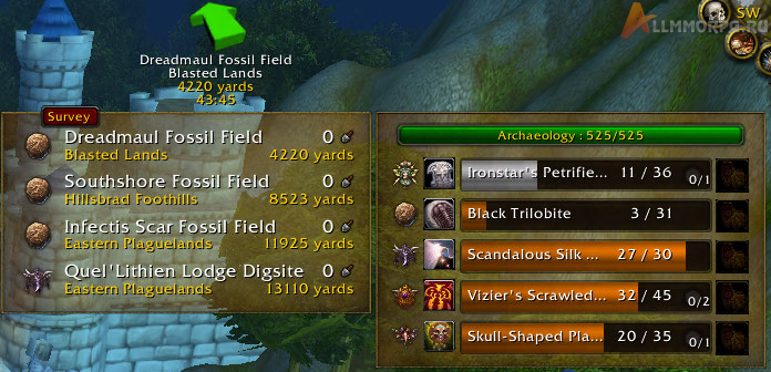 Archy - Archaeology AssistantПомогает искать наиболее удачные места для археологических раскопок. Аддон устанавливает «стрелку компас», которая указывает на множество мест раскопок. В данном моде есть фильтры поиска: выбор параметров поиска артефактов. Здесь вы можете найти огромный список всех раскопок по всему миру WoW. Так же присутствует удобная функция сбора артефактов в один клик мыши по значку расы в списке артефактов. Демонстрирует все раскопки на мини карте и запоминает места, на которых были проведены успешные раскопки. |