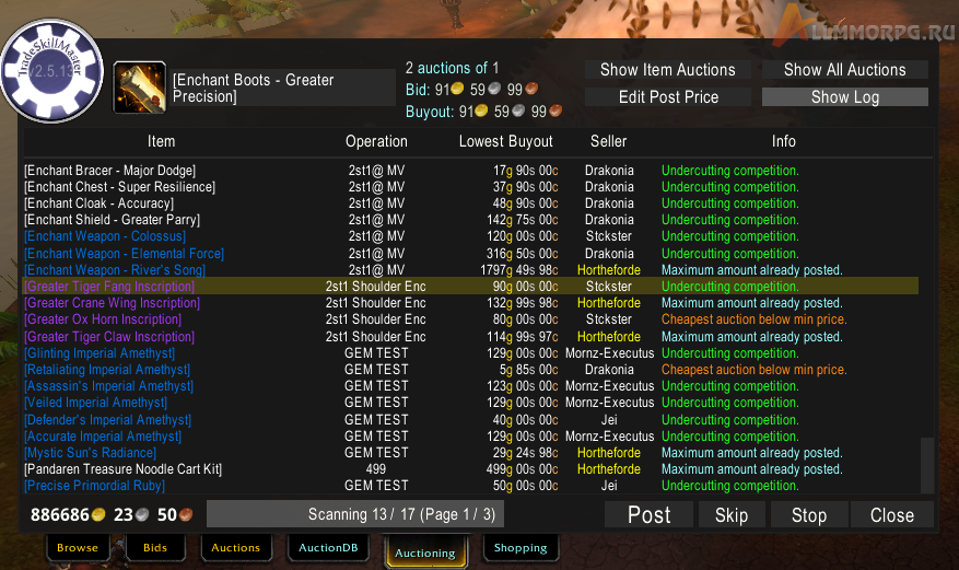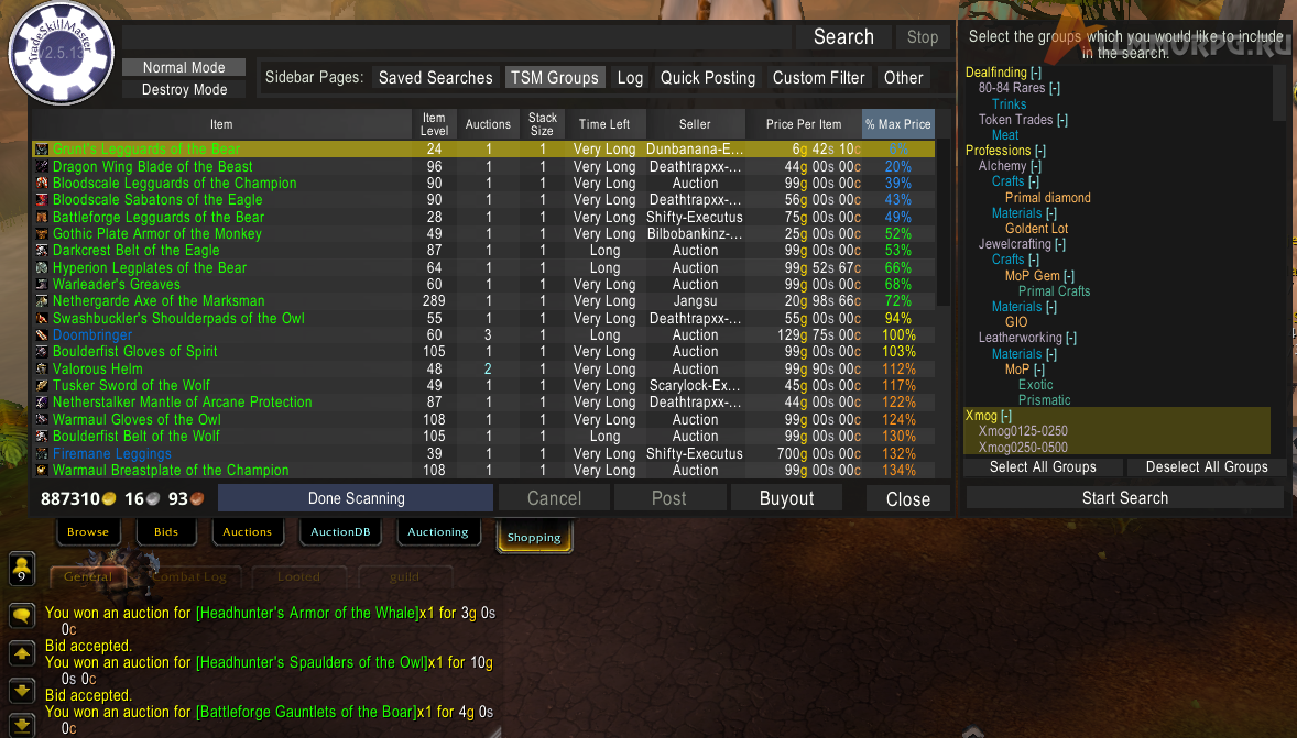 TradeSkillMaster_AuctioningАддон TradeSkillMaster представляет из себя масштабную модификацию аукциона WoW, поддерживающего дополнительные модули. Здесь есть огромное количество функций и новшеств. Аддон следит за активностью на аукционе. Так же с помощью данной модификации у вас будет возможность указать цель покупки (крафт, перепродажа и пр.) Наличие русского языка позволит вам легко справиться со многими мелкими возможностями. |