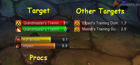 Scorchio! 2Scorchio! 2 показывает дебафы на целях при мультидотинге. Scorchio2 отслеживает заклинания – «Воспламенение», «Буря Пустоты», «Живая бомба», «Огненная глыба», «Замедление», «Возгорание», «Пироман», а также наносит 5% урона заклинаниями и полиморфы. Имеет функцию предупреждать игрока, если необходимо, об обновлениях баффы или снятия доты. |