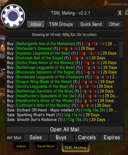 TradeSkillMaster_MailingДанный аддон является дополнительным модулем аддона TradeSkillMaster. Модуль позволяет в автоматическом режиме производить рассылку между всеми персонажами на аккаунте, а так же списку друзей и согильдейцев. Это возможно благодаря созданию списку сценариев в настройках. |