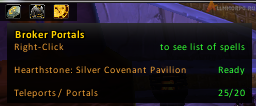 Broker_PortalsBroker Portals – аддон, подходящий исключительно магам WоW любого спека. Исходя из названия модификации, она предназначена для более удобной работы с маговскими порталами. Broker Portals создавался исключительно для того, чтобы сэкономить место ваших активных панелей (Action Bars). Так же многие игроки маги, зарабатывающие телепортацией других игроков WоW, и используют его в связке с Easy Portal Adver (для рекламного заработка на порталах мага). |