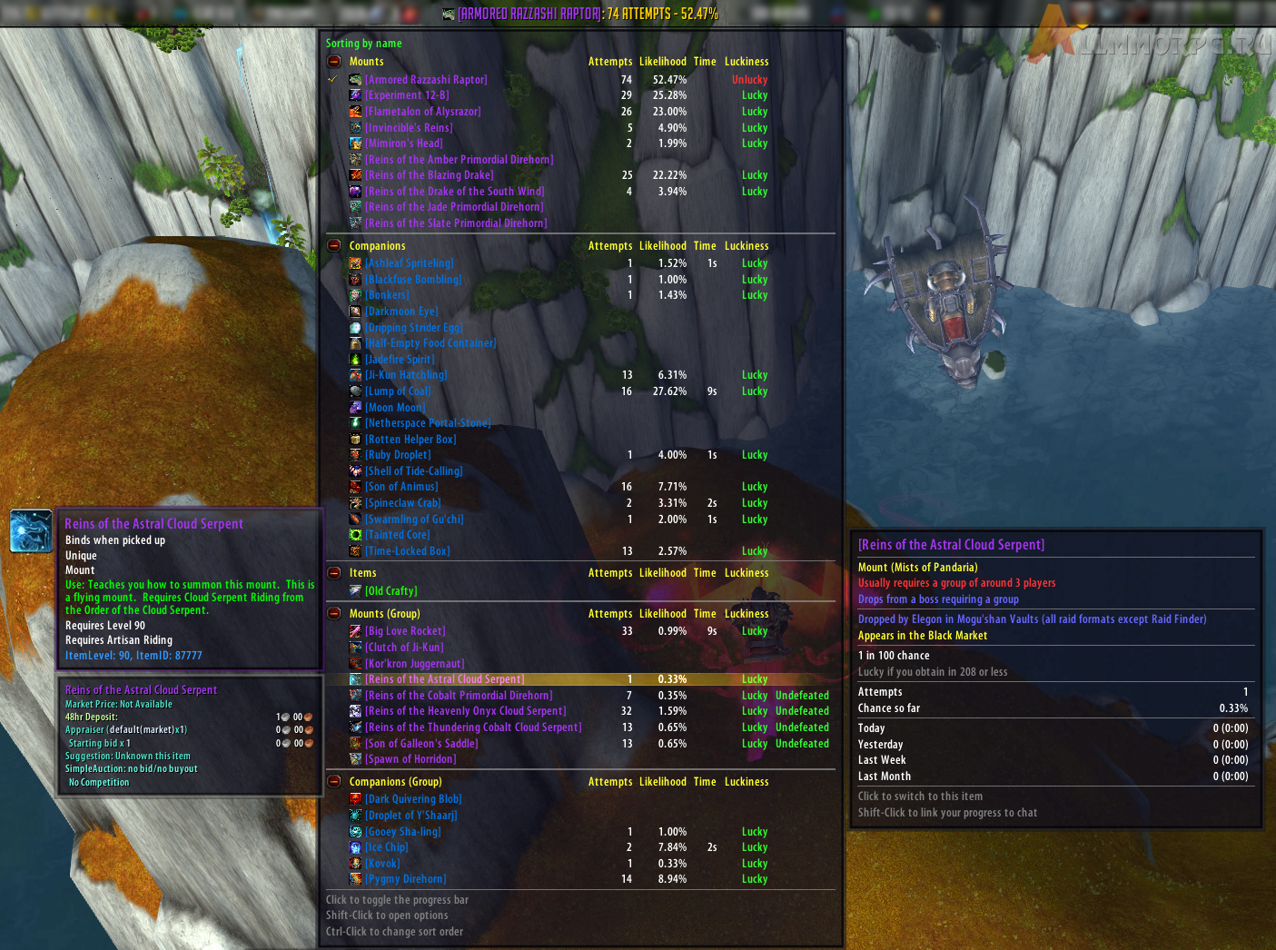 RarityАддон Rarity - это отличный помощник любому фармеру. Он имеет свойство отслеживать процентное соотношения шансов, с которым вам выпала редкая вещь. Например, на wowhead шанс дропа 4.5%. При отслеживании шанса дропа, в статистике мода, с каждым новым лутом, процент выпада будет уменьшатся. Со 100% до заветных 4.5%, что означает - скоро вещь выпадет. Отличный инструмент, который наиболее актуален в фарме редких питомцев, маунтов а также в археологии. Поддерживает всплывающие подсказки, информирующие вас, насколько вы продвинулись в прогрессе и дальнейший шанс дропа (в процентах). Позволяет отслеживать вещи по выбору, или группами. Включает в себя функции старой модификации Bunny Hunter, схожей по своей структуре. |