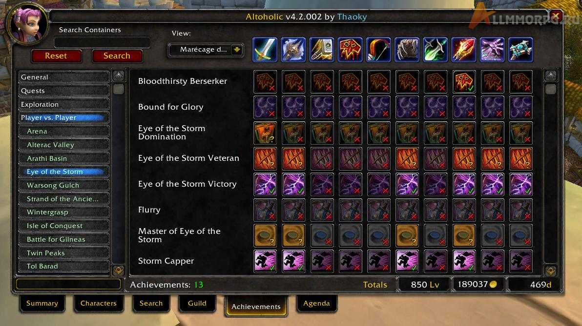 AltoholicС помощью аддона Altoholic у вас появится возможность запоминать весь инвентарь каждого из ваших персонажей на аккаунте. Так же он поможет в прокачке проффесий, то есть при смене персонажа, аддон запоминает весь инвентарь, одежду, скил крафта, репутацию этих персонажей. И позволит просматривать её, играя за любого из персонажей. |