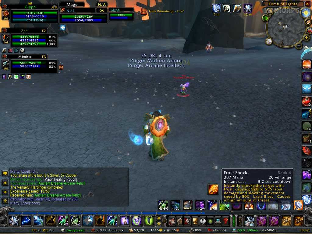 Shaman FriendАддон Shaman Friend, как видно из названия, эффективен лишь только для шаманов. Является концентратором информации о всевозможных щитах, тотемах и действующих проках и использовании «жажды крови». Имеет модульную основу, что позволяет использовать лишь нужные игроку параметры. |