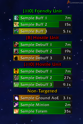 Ellipsis (Multi-Target DoT Timers)Аддон Ellipsis (Multi-Target DoT Timers) позволяет отслеживать все дебафы и доты, активные в данное время на всех целях, страдающих от ваших заклинаний. Примечателен тем, что подходит любому классу и может в индивидуальном порядке оповещать о нестандартных спелах. |