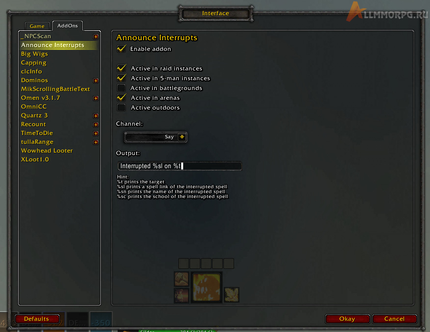 Announce InterruptsAnnounce Interrupts очень легкий в использовании аддон. Announce Interrupts оповещает в чат всей группе или рейду о том, когда требуется перестать читать заклинания. В настройках возможен выбор того, где мод будет активен: Рейд, Инст, Арена или в других местах. |